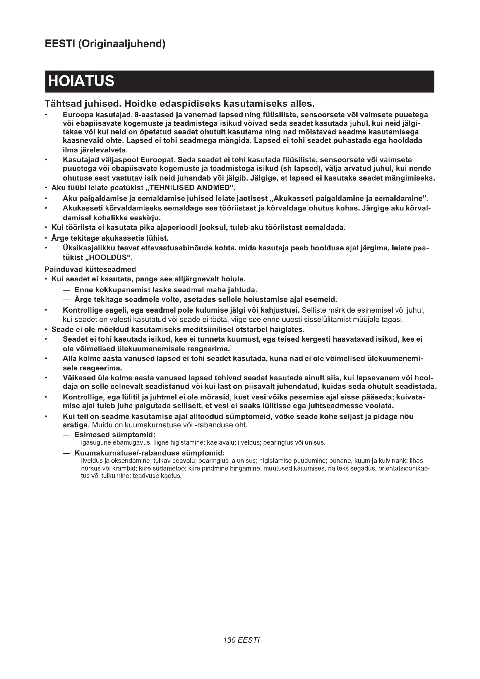 EESTI (Originaaljuhend) HOIATUS Tähtsad juhised. Hoidke edaspidiseks kasutamiseks alles.