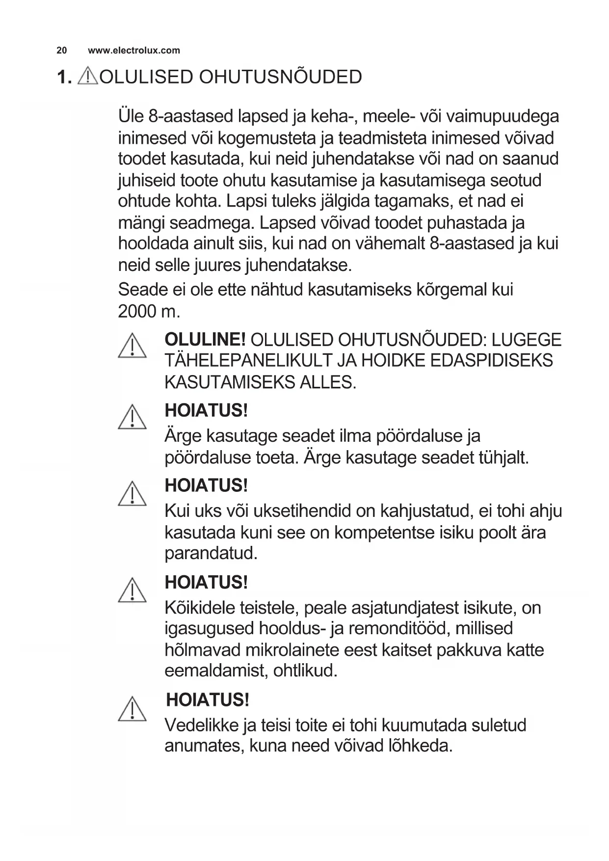 - 8. KesKKOnnateave ELECTROLUX_Estonian_25LGRILL_SBI_BASE_AJ26UICTO_Layout 1 25/01/2022 09:07 Page 1920 www.electrolux.com üle 8-aastased lapsed ja keha-, meele- või vaimupuudega inimesed või kogemusteta ja teadmisteta inimesed võivad toodet kasutada, kui neid juhendatakse või nad on saanud juhiseid toote ohutu kasutamise ja kasutamisega seotud ohtude kohta. lapsi tuleks jälgida tagamaks, et nad ei mängi seadmega. lapsed võivad toodet puhastada ja hooldada ainult siis, kui nad on vähemalt 8-aastased ja kui neid selle juures juhendatakse. seade ei ole ette nähtud kasutamiseks kõrgemal kui 2000 m. OLULINE! Olulised Ohutusnõuded: lugege tähelePaneliKult Ja hOidKe edasPidiseKs KasutamiseKs alles. HOIATUS! ärge kasutage seadet ilma pöördaluse ja pöördaluse toeta. ärge kasutage seadet tühjalt. HOIATUS! Kui uks või uksetihendid on kahjustatud, ei tohi ahju kasutada kuni see on kompetentse isiku poolt ära parandatud. HOIATUS! Kõikidele teistele, peale asjatundjatest isikute, on igasugused hooldus- ja remonditööd, millised hõlmavad mikrolainete eest kaitset pakkuva katte eemaldamist, ohtlikud. HOIATUS! vedelikke ja teisi toite ei tohi kuumutada suletud anumates, kuna need võivad lõhkeda. p. 35