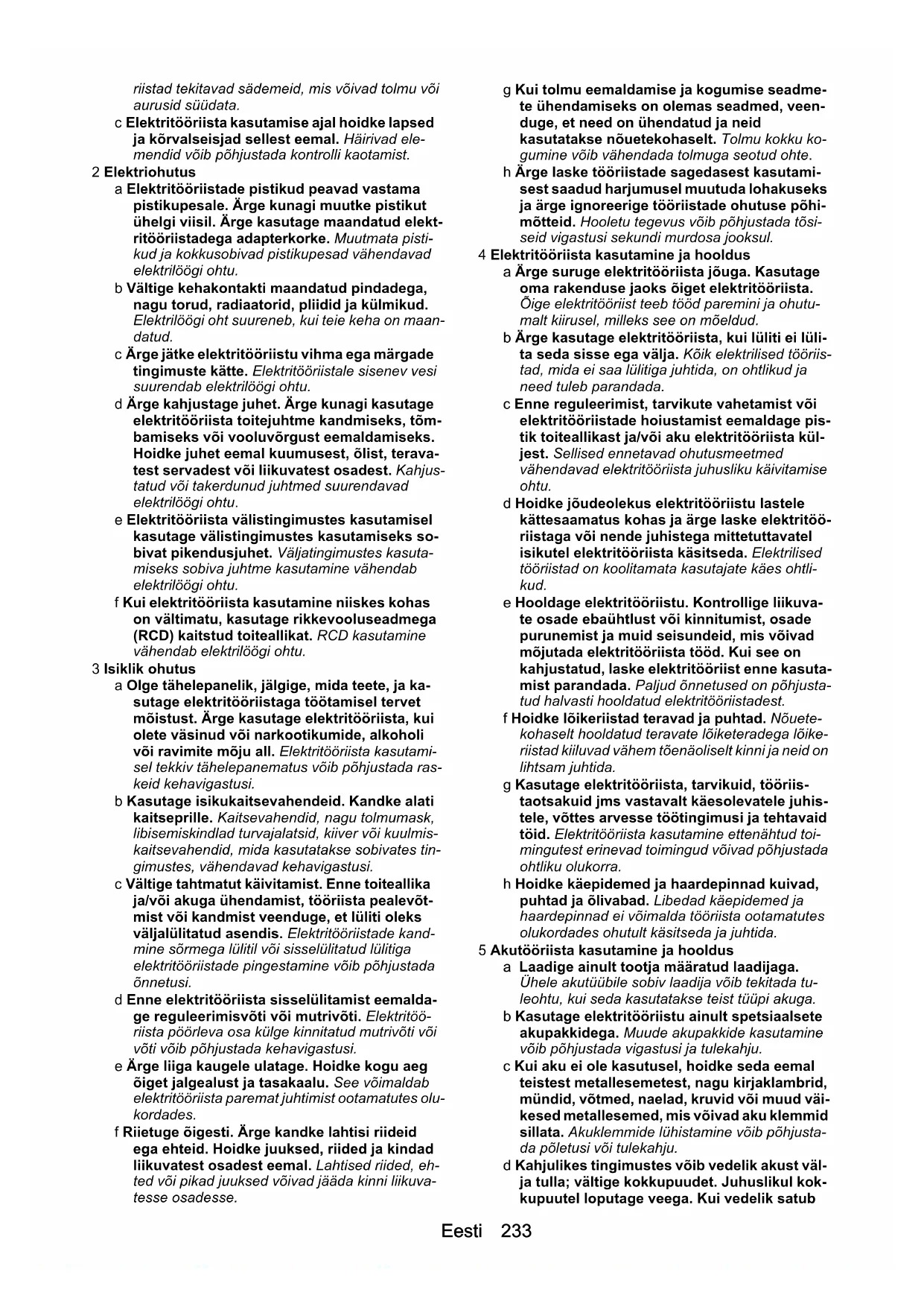 • пълномощници на управителния орган. Пълномощник по документацията: S. Reiser Alfred Kärcher SE & Co. KG Alfred-Kärcher-Str. 28 - 40 71364 Winnenden (Germany) Тел.: +49 7195 14-0 Факс: +49 7195 14-2212 Виненден, 2023/06/01 Sisukord Ohutusjuhised Lugege enne seadme esmakordset kasutamist seda algupärast kasutusjuhendit ja ohutusjuhi- seid ning akupaki ja laadijaga kaasasolevaid al- gupäraseid kasutusjuhendeid ja ohutusjuhiseid. Toimige sellele vastavalt. Hoidke kõik kasutusjuhendid hilisemaks kasutamiseks või järgmise omaniku tarbeks alles. Lisaks kasutusjuhendites esitatud juhistele tuleb teil ar- vesse võtta ka seadusandja üldisi ohutusalaseid ja õn- netuse ennetamise eeskirju. Ohuastmed OHT ● Viide vahetult ähvardavale ohule, mis võib põhjusta- da raskeid kehavigastusi või lõppeda surmaga. 몇 HOIATUS ● Viide võimalikule ohtlikule olukorrale, mis võib põh- justada raskeid kehavigastusi või lõppeda surmaga. 몇 ETTEVAATUS ● Viide võimalikule ohtlikule olukorrale, mis võib põh- justada kergeid vigastusi. TÄHELEPANU ● Viide võimalikule ohtlikule olukorrale, mis võib põh- justada varakahjusid. Elektritööriistade üldised ohutusjuhised 몇 HOIATUS ● Lugege läbi kõik selle elektritööriistaga kaasas olevad ohutushoiatused, juhised, illustratsioonid ja spetsifikatsioonid. Alltoodud juhiste eiramine võib põhjustada elektrilöö- gi, tulekahju ja/või raskeid vigastusi. Salvestage kõik hoiatused ja juhised edaspidiseks kasutamiseks. Hoiatustes kasutatud termin "elektritööriist" viitab teie võrgutoitega (juhtmega) elektritööriistale või akutoitega (juhtmeta) elektritööriistale. 1 Tööala ohutus a Hoidke tööala puhas ja hästi valgustatud. Kit- sad või hämarad alad põhjustavad õnnetusi. b Ärge kasutage elektritööriistu plahvatusohtli- kus keskkonnas, näiteks tuleohtlike vedelike, gaaside või tolmu läheduses. Elektrilised töö- Ohutusjuhised p. 232