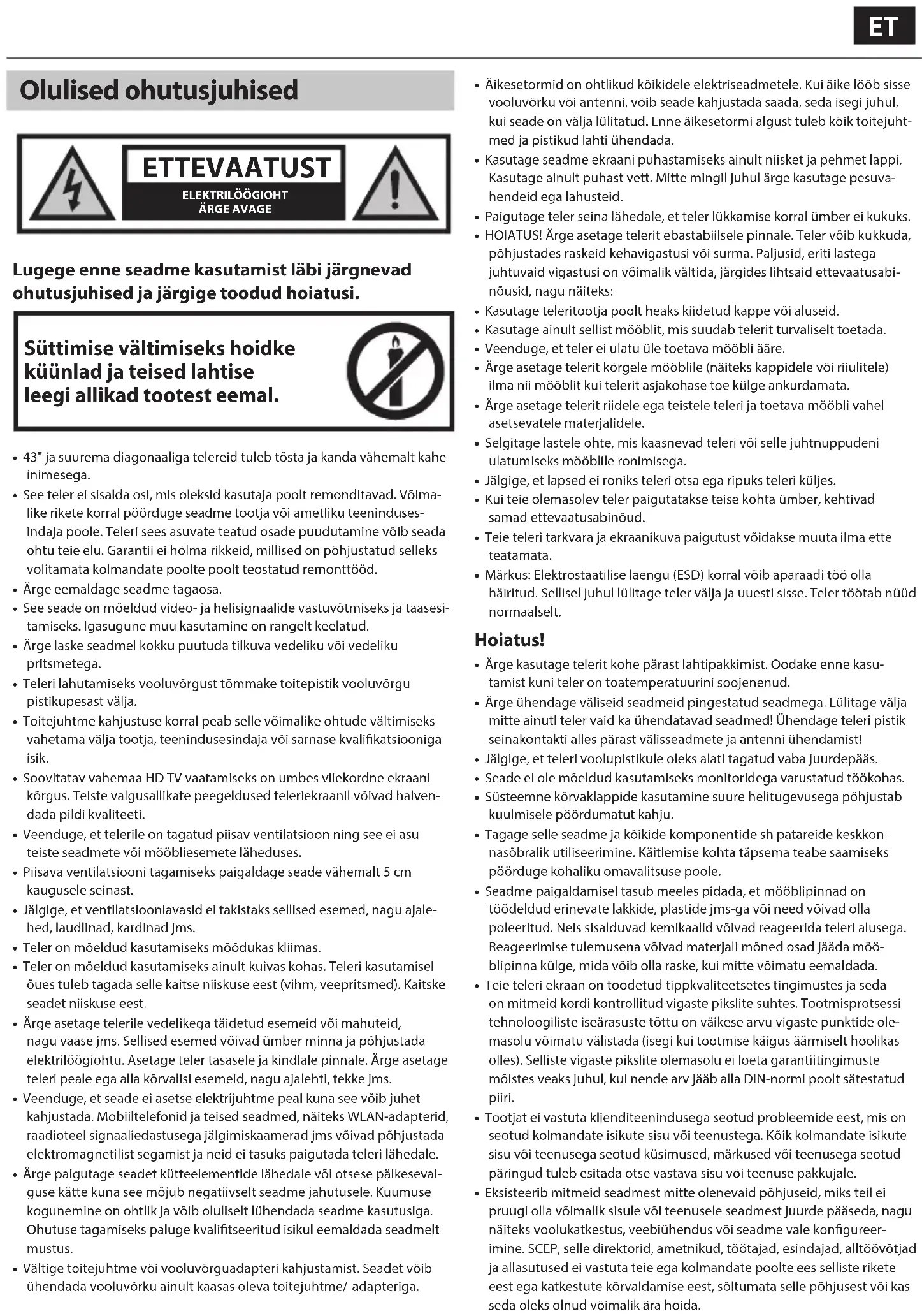 Lugege enne seadme kasutamist läbi järgnevad ohutusjuhised ja järgige toodud hoiatusi. Süttimise vältimiseks hoidke küünlad ja teised lahtise leegi allikad tootest eemal.