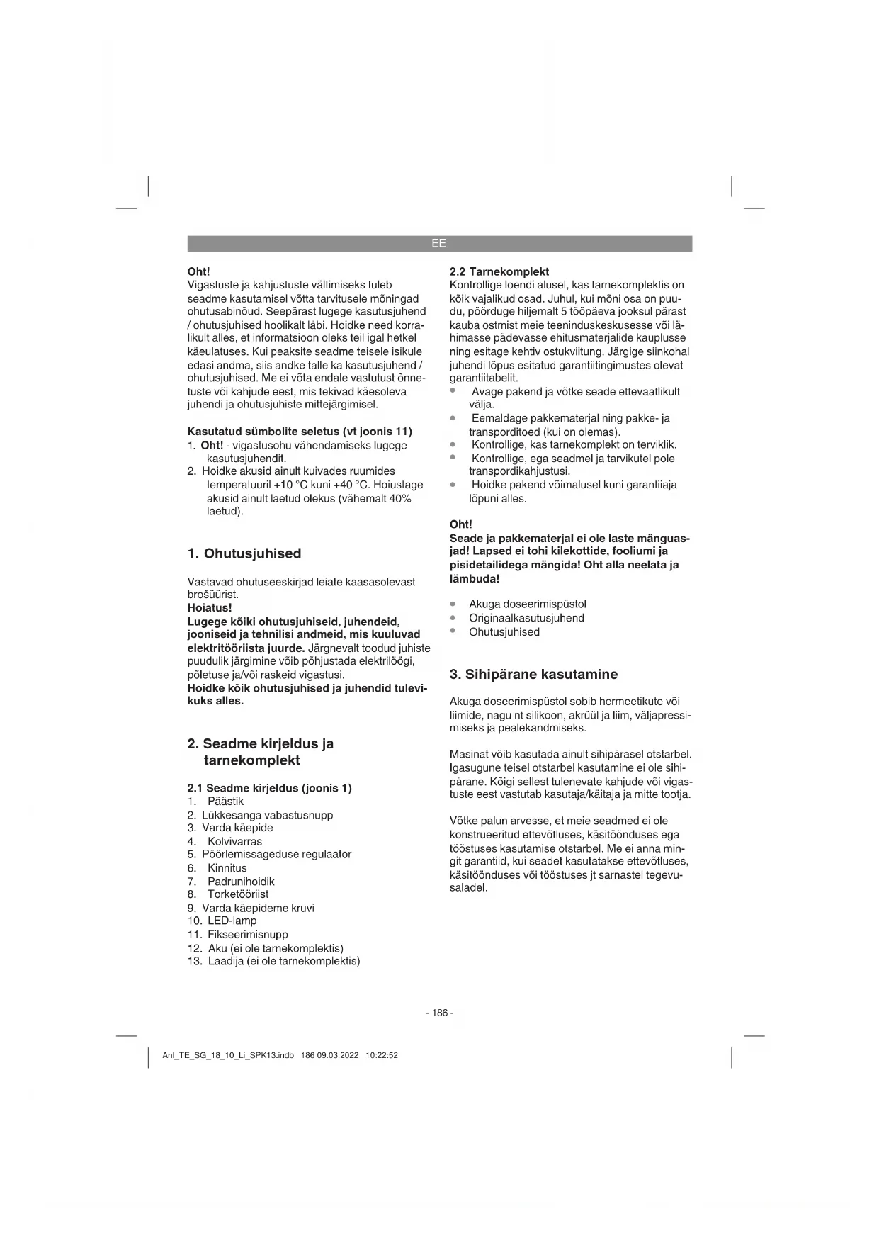 Akuga doseerimispüstol sobib hermeetikute või liimide, nagu nt silikoon, akrüül ja liim, väljapressi- miseks ja pealekandmiseks. Masinat võib kasutada ainult sihipärasel otstarbel. Igasugune teisel otstarbel kasutamine ei ole sihi- pärane. Kõigi sellest tulenevate kahjude või vigas- tuste eest vastutab kasutaja/käitaja ja mitte tootja. Võtke palun arvesse, et meie seadmed ei ole konstrueeritud ettevõtluses, käsitöönduses ega tööstuses kasutamise otstarbel. Me ei anna min- git garantiid, kui seadet kasutatakse ettevõtluses, käsitöönduses või tööstuses jt sarnastel tegevu- saladel. Anl_TE_SG_18_10_Li_SPK13.indb 186 09.03.2022 10:22:52EE