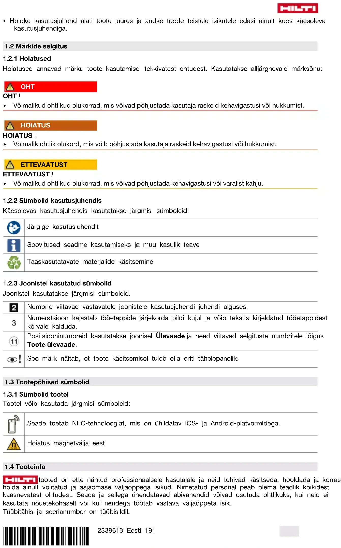 - Järgige käesolevas kasutusjuhendis ja seadmel esitatud ohutusnõudeid ja hoiatusi.*2339613* 2339613 Eesti 191