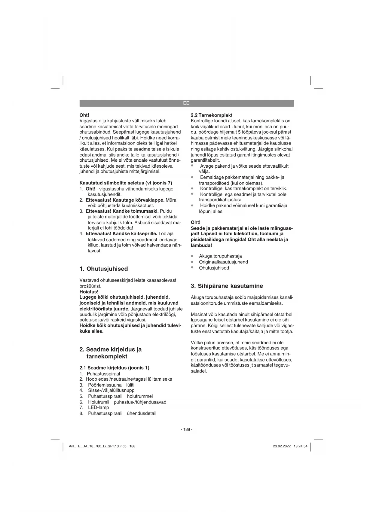 Akuga torupuhastaja sobib majapidamises kanali- satsioonitorude ummistuste eemaldamiseks. Masinat võib kasutada ainult sihipärasel otstarbel. Igasugune teisel otstarbel kasutamine ei ole sihi- pärane. Kõigi sellest tulenevate kahjude või vigas- tuste eest vastutab kasutaja/käitaja ja mitte tootja. Võtke palun arvesse, et meie seadmed ei ole konstrueeritud ettevõtluses, käsitöönduses ega tööstuses kasutamise otstarbel. Me ei anna min- git garantiid, kui seadet kasutatakse ettevõtluses, käsitöönduses või tööstuses jt sarnastel tegevu- saladel. Anl_TE_DA_18_760_Li_SPK13.indb 188Anl_TE_DA_18_760_Li_SPK13.indb 188 23.02.2022 13:24:5423.02.2022 13:24:54EE