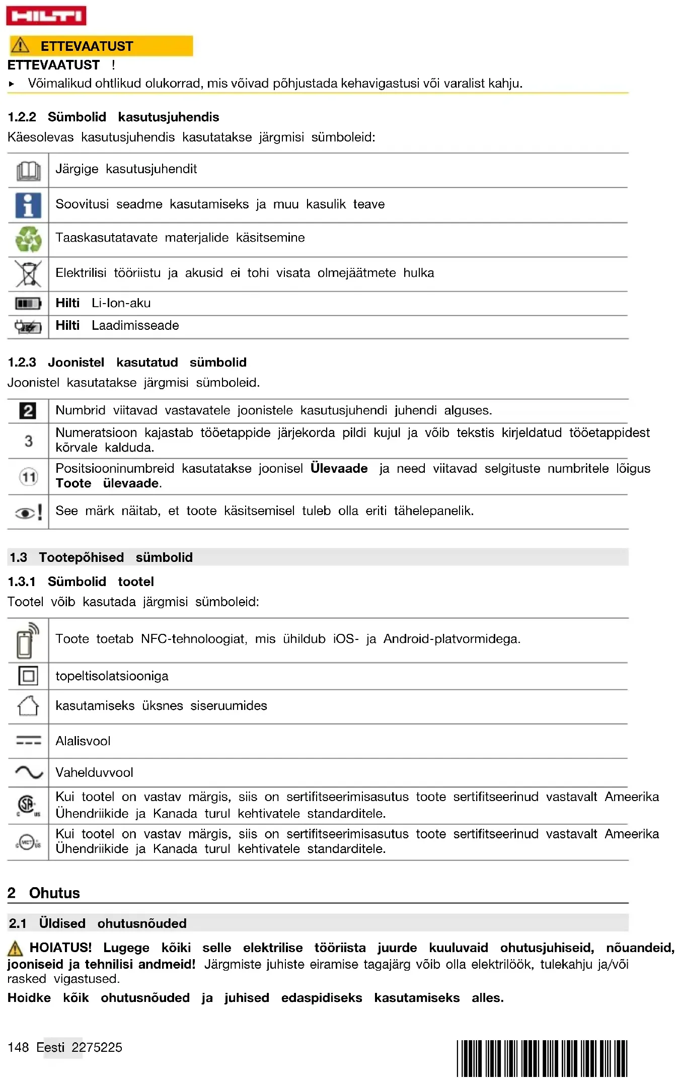 Käesolevas kasutusjuhendis kasutatakse järgmisi sümboleid: Järgige kasutusjuhendit Soovitusi seadme kasutamiseks ja muu kasulik teave Taaskasutatavate materjalide käsitsemine Elektrilisi tööriistu ja akusid ei tohi visata olmejäätmete hulka Hilti Li-Ion-aku Hilti Laadimisseade