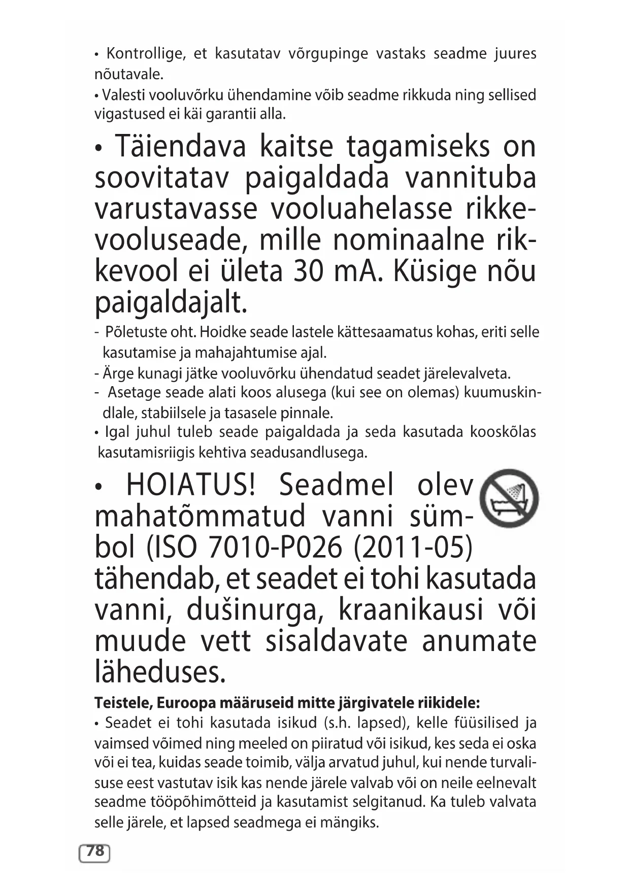 - HOIATUS! Seadmel olev mahatõmmatud vanni süm- bol (ISO 7010-P026 (2011-05) tähendab, et seadet ei tohi kasutada vanni, dušinurga, kraanikausi või muude vett sisaldavate anumate läheduses. Teistele, Euroopa määruseid mitte järgivatele riikidele: