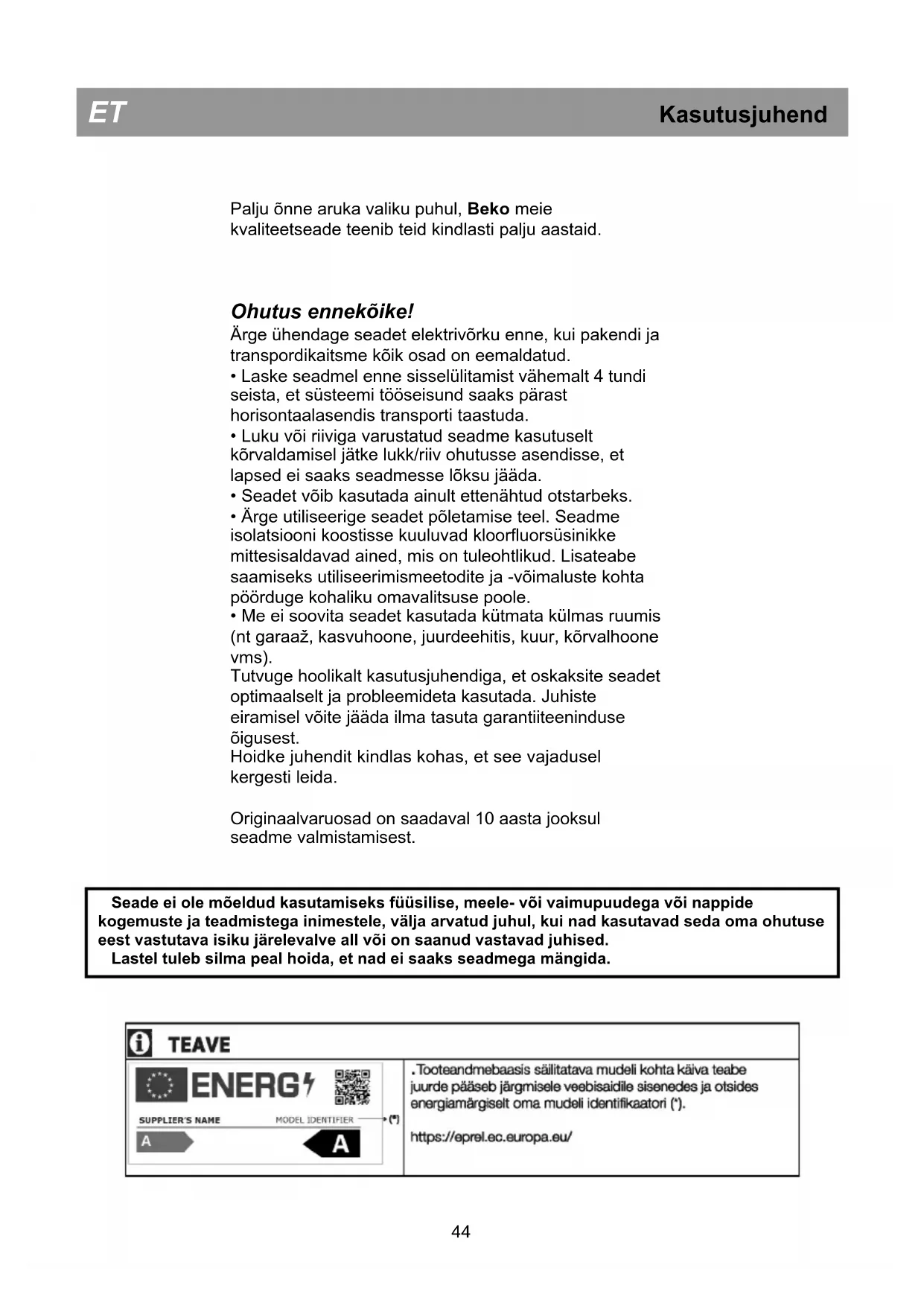 ET Kasutusjuhend Elektriohutus Enne seadme ühendamist vooluvõrku kontrollige, kas seadme sees paiknevale andmesildile märgitud toitepinge ja sagedus vastavad vooluvõrgu näitajatele. Soovitame ühendada seadme vooluvõrku sobivas kohas paikneva kaitsmega varustatud seinakontakti kaudu. Pärast paigaldamist peab säilima juurdepääs pistikule, et seadet oleks võimalik vooluvõrgust lahutada. Hoiatus! Seade peab olema maandatud. Elektriseadmete remondiga võivad tegelda ainult kvalifitseeritud spetsialistid. Kui toitejuhe on kahjustatud, peab tootja või klienditeenindus selle ohu vältimiseks asendama. TÄHELEPANU! Seadmes on kasutusel külmutusagens R600a, mis on keskkonnasõbralik, kuid tuleohtlik gaas. Toodet tuleb transportida ja paigaldada ettevaatlikult, et mitte kahjustada jahutussüsteemi. Kui jahutussüsteem on viga saanud ja on tekkinud gaasileke, hoidke toodet eemal lahtistest leekidest ja tuulutage veidi aega ruumi. HOIATUS: ärge kasutage sulatusprotsessi kiirendamiseks mehaanilisi vms abivahendeid peale tootja soovitatute. HOIATUS: ärge kahjustage külmutusagensikontuuri. HOIATUS: ärge kasutage toiduainete hoiukambrites elektriseadmeid, välja arvatud tootja soovitatud seadmetüübid. HOIATUS: ohtude vältimiseks peab defektse toitejuhtme välja vahetama tootja, volitatud teenindus või samaväärse kvalifikatsiooniga isik. Transpordieeskirjad