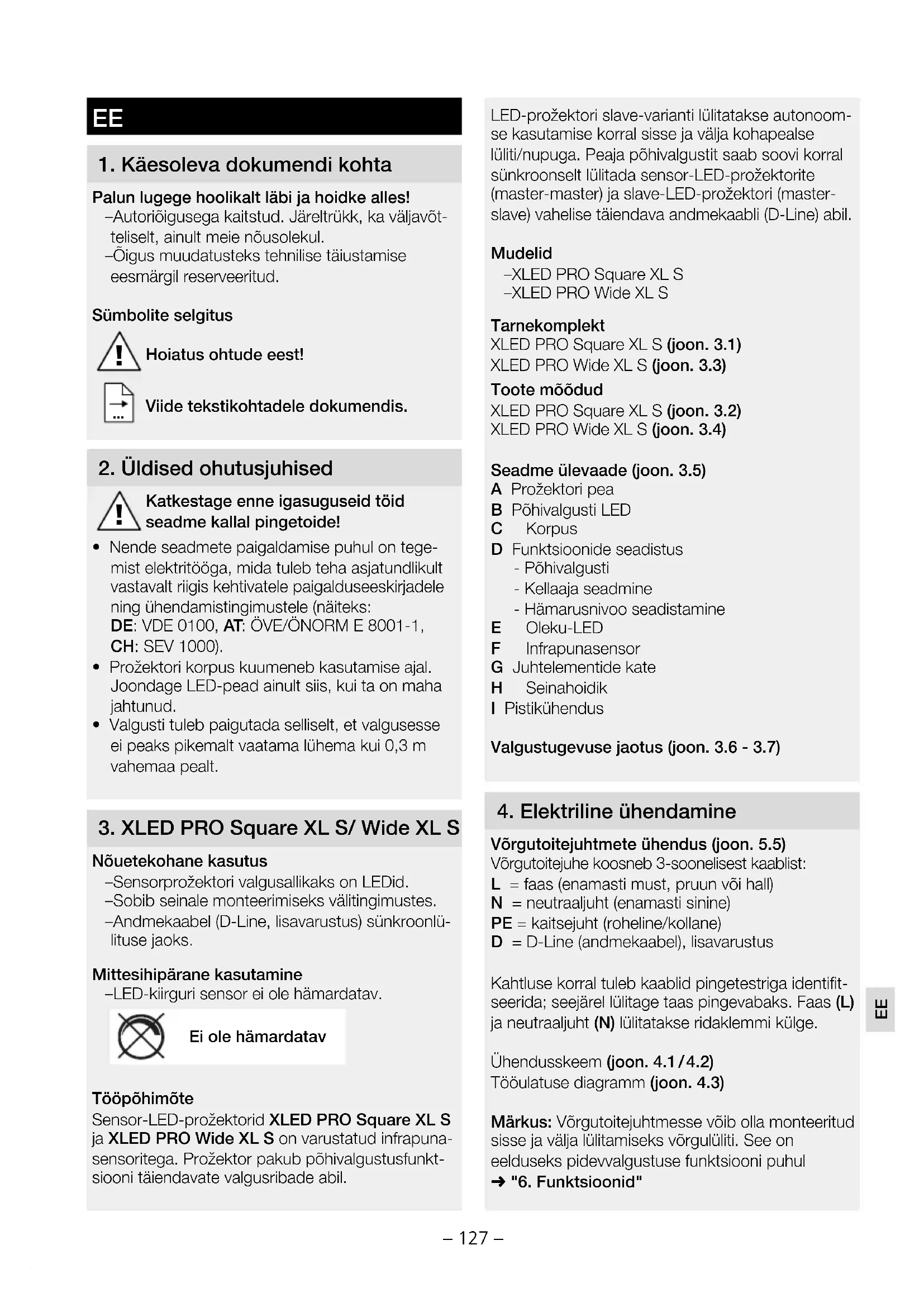 Nõuetekohane kasutus – Sensorprožektori valgusallikaks on LEDid. – Sobib seinale monteerimiseks välitingimustes. – Andmekaabel (D-Line, lisavarustus) sünkroonlü- lituse jaoks. Mittesihipärane kasutamine – LED-kiirguri sensor ei ole hämardatav. Ei ole hämardatav Tööpõhimõte Sensor-LED-prožektorid XLEDPROSquareXLS ja XLEDPROWideXLS on varustatud infrapuna- sensoritega. Prožektor pakub põhivalgustusfunkt- siooni täiendavate valgusribade abil. LED-prožektori slave-varianti lülitatakse autonoom- se kasutamise korral sisse ja välja kohapealse lüliti/nupuga. Peaja põhivalgustit saab soovi korral sünkroonselt lülitada sensor-LED-prožektorite (master-master) ja slave-LED-prožektori (master- slave) vahelise täiendava andmekaabli (D-Line) abil. Mudelid – XLEDPROSquareXLS – XLEDPROWideXLS Tarnekomplekt XLEDPROSquareXLS (joon. 3.1) XLEDPROWideXLS (joon. 3.3) Toote mõõdud XLEDPROSquareXLS (joon. 3.2) XLEDPROWideXLS (joon. 3.4) Seadme ülevaade (joon. 3.5) A Prožektori pea B Põhivalgusti LED C Korpus D Funktsioonide seadistus - Põhivalgusti - Kellaaja seadmine - Hämarusnivoo seadistamine E Oleku-LED F Infrapunasensor G Juhtelementide kate H Seinahoidik I Pistikühendus Valgustugevuse jaotus (joon. 3.6 - 3.7)