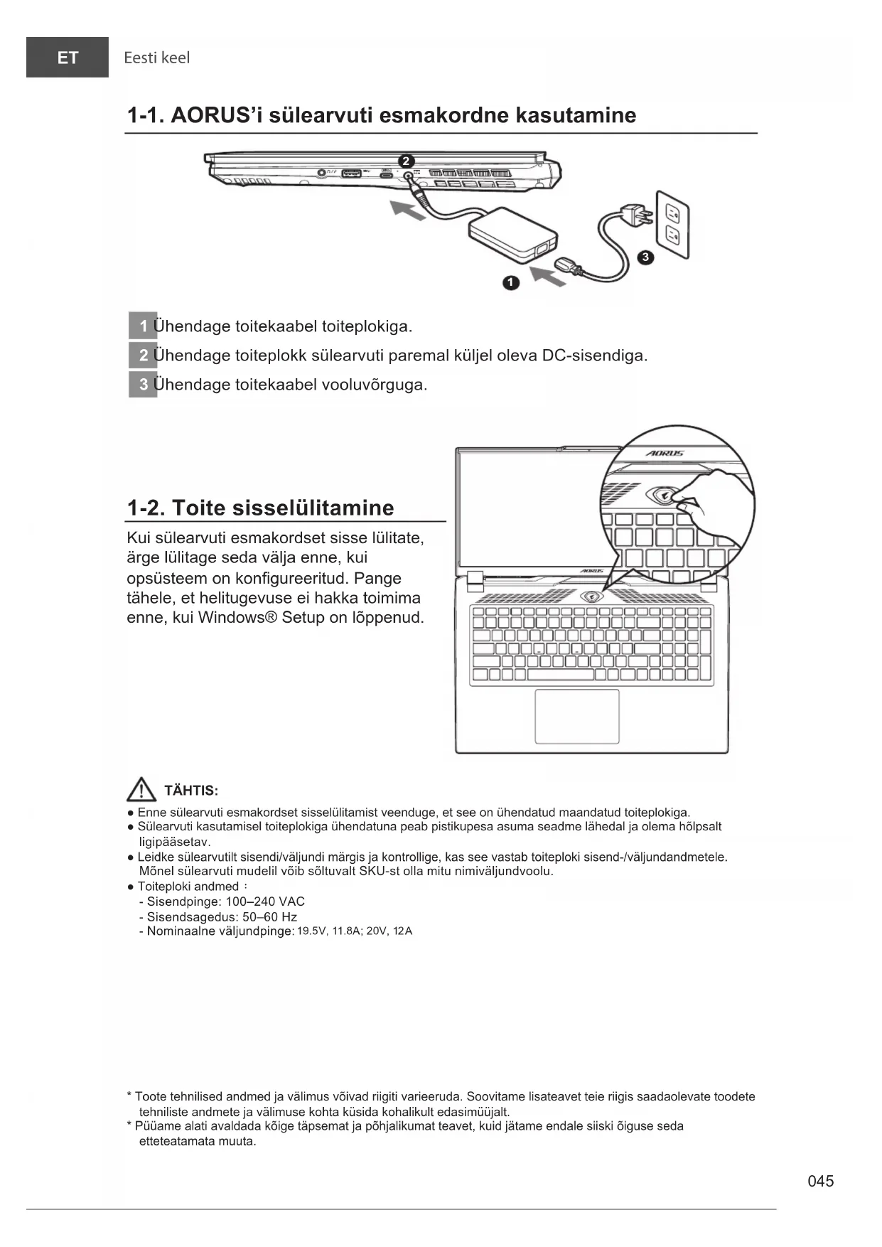 1-1. AORUS’i sülearvuti esmakordne kasutamine DCIN