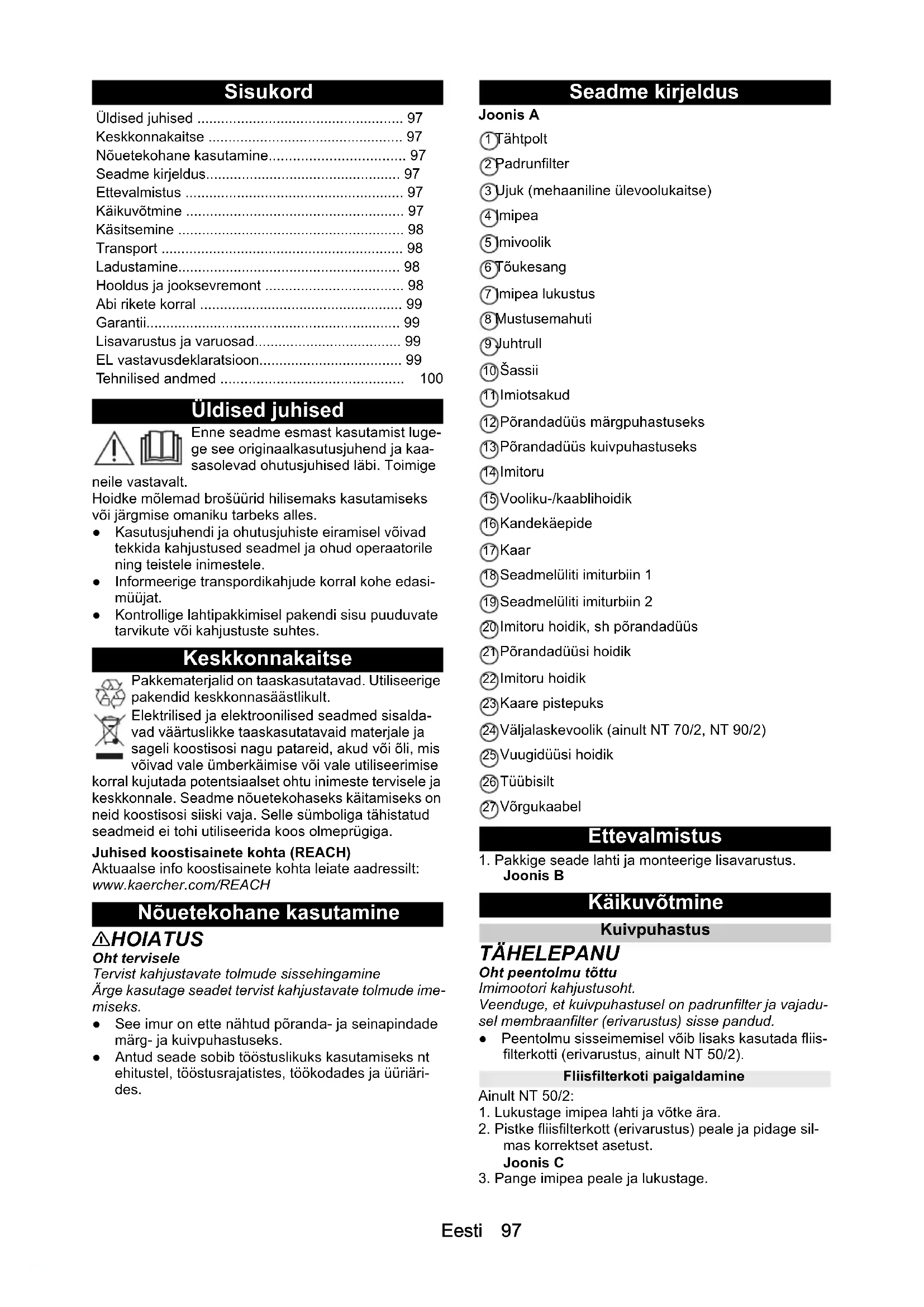 H05VV-F 2x1,0 H05VV-F 2x1,0 H05VV-F 2x1,0 Номер на част (EU) 9.770-933.0 9.770-933.0 9.770-933.0 Дължина на кабел m 7,5 7,5 7,5Eesti 97 Sisukord Üldised juhised Enne seadme esmast kasutamist luge- ge see originaalkasutusjuhend ja kaa- sasolevad ohutusjuhised läbi. Toimige neile vastavalt. Hoidke mõlemad brošüürid hilisemaks kasutamiseks või järgmise omaniku tarbeks alles. ● Kasutusjuhendi ja ohutusjuhiste eiramisel võivad tekkida kahjustused seadmel ja ohud operaatorile ning teistele inimestele. ● Informeerige transpordikahjude korral kohe edasi- müüjat. ● Kontrollige lahtipakkimisel pakendi sisu puuduvate tarvikute või kahjustuste suhtes. Keskkonnakaitse Pakkematerjalid on taaskasutatavad. Utiliseerige pakendid keskkonnasäästlikult. Elektrilised ja elektroonilised seadmed sisalda- vad väärtuslikke taaskasutatavaid materjale ja sageli koostisosi nagu patareid, akud või õli, mis võivad vale ümberkäimise või vale utiliseerimise korral kujutada potentsiaalset ohtu inimeste tervisele ja keskkonnale. Seadme nõuetekohaseks käitamiseks on neid koostisosi siiski vaja. Selle sümboliga tähistatud seadmeid ei tohi utiliseerida koos olmeprügiga. Juhised koostisainete kohta (REACH) Aktuaalse info koostisainete kohta leiate aadressilt: www.kaercher.com/REACH Nõuetekohane kasutamine 몇 HOIATUS Oht tervisele Tervist kahjustavate tolmude sissehingamine Ärge kasutage seadet tervist kahjustavate tolmude ime- miseks. ● See imur on ette nähtud põranda- ja seinapindade märg- ja kuivpuhastuseks. ● Antud seade sobib tööstuslikuks kasutamiseks nt ehitustel, tööstusrajatistes, töökodades ja üüriäri- des. Seadme kirjeldus Joonis A 1 Tähtpolt 2 Padrunfilter 3 Ujuk (mehaaniline ülevoolukaitse) 4 Imipea 5 Imivoolik 6 Tõukesang 7 Imipea lukustus 8 Mustusemahuti 9 Juhtrull 10 Šassii 11 Imiotsakud 12 Põrandadüüs märgpuhastuseks 13 Põrandadüüs kuivpuhastuseks 14 Imitoru 15 Vooliku-/kaablihoidik 16 Kandekäepide 17 Kaar 18 Seadmelüliti imiturbiin 1 19 Seadmelüliti imiturbiin 2 20 Imitoru hoidik, sh põrandadüüs 21 Põrandadüüsi hoidik 22 Imitoru hoidik 23 Kaare pistepuks 24 Väljalaskevoolik (ainult NT 70/2, NT 90/2) 25 Vuugidüüsi hoidik 26 Tüübisilt 27 Võrgukaabel Ettevalmistus
