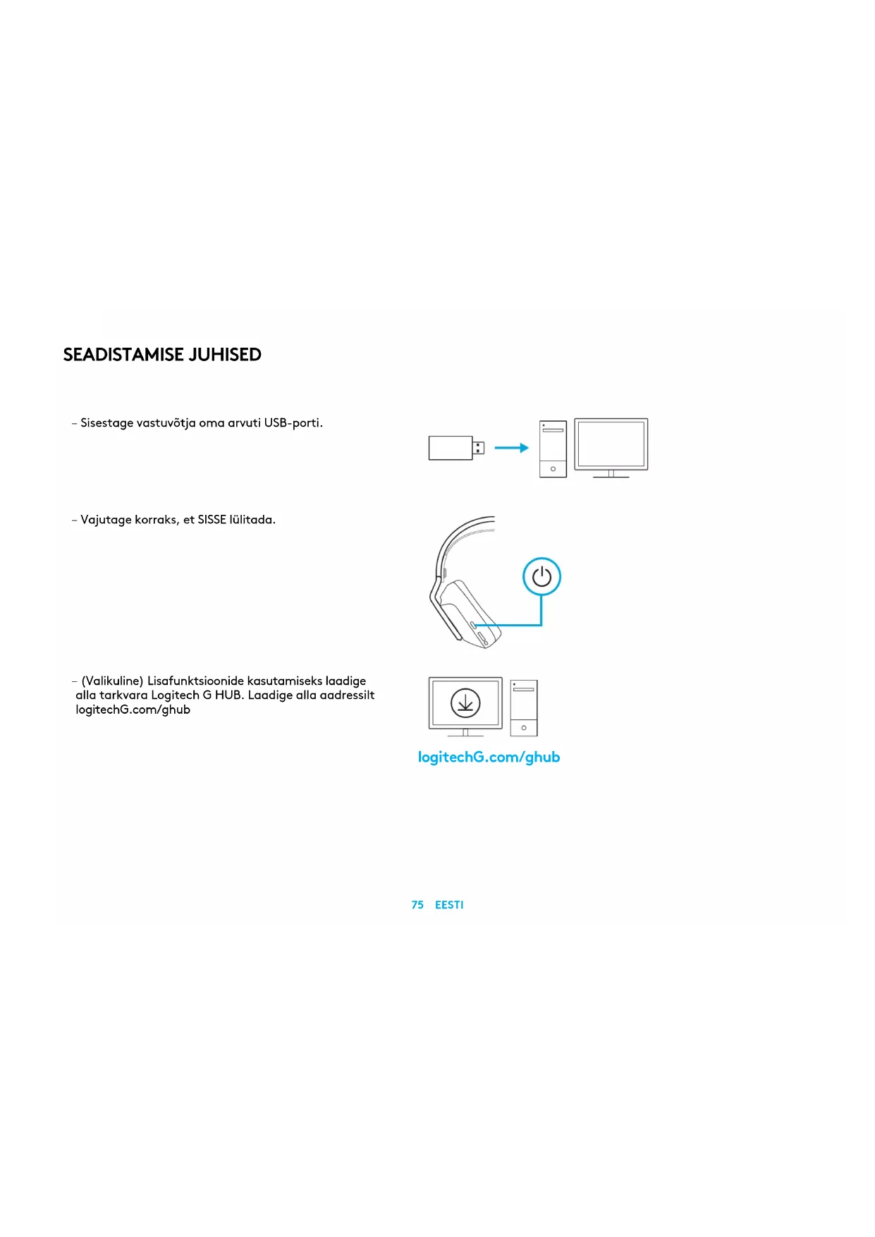 675 EESTI SEADISTAMISE JUHISED – Sisestage vastuvõtja oma arvuti USB-porti. – Vajutage korraks, et SISSE lülitada. – (Valikuline) Lisafunktsioonide kasutamiseks laadige allatarkvara Logitech G HUB. Laadige alla aadressilt logitechG.com/ghub logitechG.com/ghub76 EESTI – Kõrvaklappe saab reguleerida üles ja alla. – Peaosa pikkust saab reguleerida.77 EESTI – Vaigistamiseks keerake mikrofonivars üles. – Aku tühjenemisel laadige peakomplekti.78 EESTI KIRJELDUS 1 Reguleeritav, ümberpööratav kinnitusrihm 2 Memory-foam tehnoloogiat kasutavad kõrvapadjad 3 40 mm draiverid 4 Helitugevus kõrva peal 5 Vaigistamiseks keeratav 6 mm mikrofon 6 USB-C-laadimisport