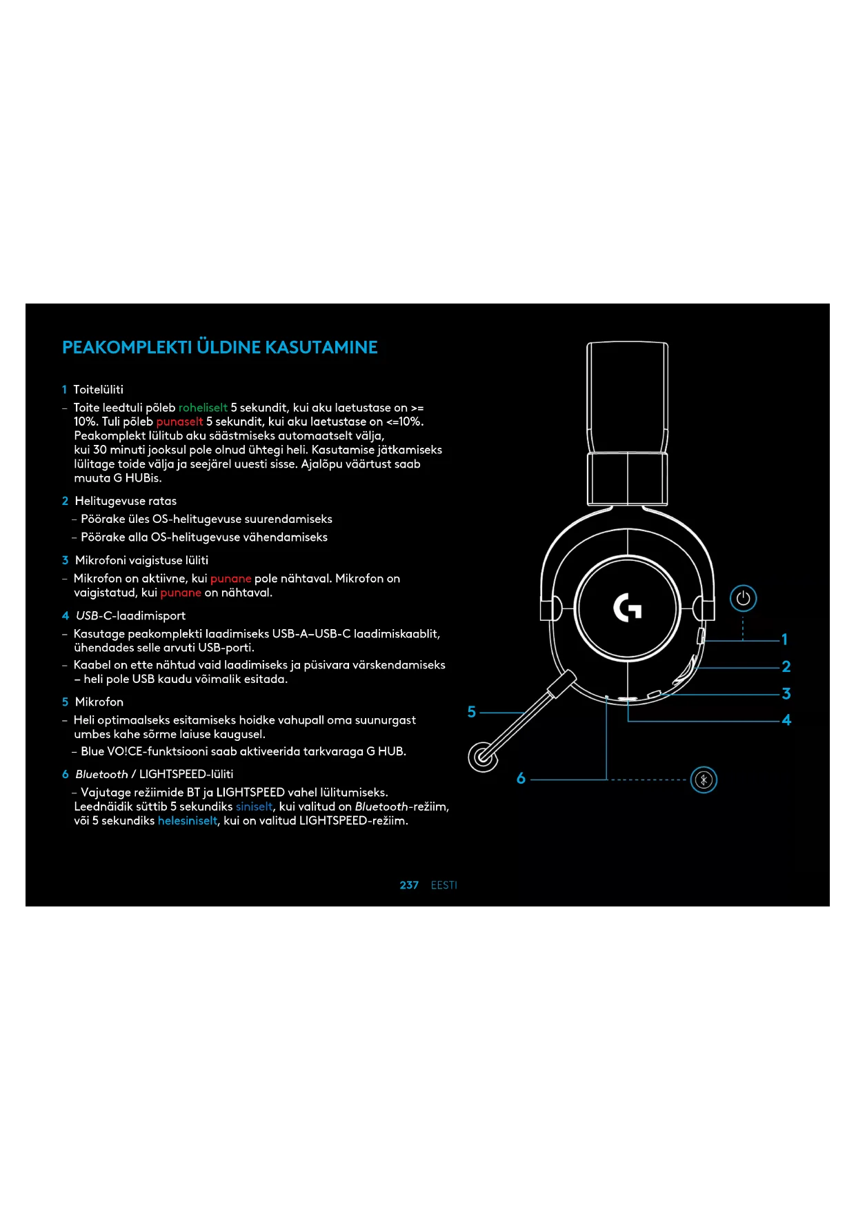 1 Toitelüliti – Toite leedtuli põleb roheliselt 5 sekundit, kui aku laetustase on>= 10%. Tuli põleb punaselt 5 sekundit, kui aku laetustase on<=10%. Peakomplekt lülitub aku säästmiseks automaatselt välja, kui30minuti jooksul pole olnud ühtegi heli. Kasutamise jätkamiseks lülitage toide välja ja seejärel uuesti sisse. Ajalõpu väärtust saab muuta GHUBis. 2 Helitugevuse ratas – Pöörake üles OS-helitugevuse suurendamiseks – Pöörake alla OS-helitugevuse vähendamiseks 3 Mikrofoni vaigistuse lüliti – Mikrofon on aktiivne, kui punane pole nähtaval. Mikrofon on vaigistatud, kui punane on nähtaval. 4 USB-C-laadimisport – Kasutage peakomplekti laadimiseks USB-A–USB-C laadimiskaablit, ühendades selle arvuti USB-porti. – Kaabel on ette nähtud vaid laadimiseks ja püsivara värskendamiseks – heli pole USB kaudu võimalik esitada. 5 Mikrofon – Heli optimaalseks esitamiseks hoidke vahupall oma suunurgast umbes kahe sõrme laiuse kaugusel. – Blue VO!CE-funktsiooni saab aktiveerida tarkvaraga G HUB. 6 Bluetooth / LIGHTSPEED-lüliti – Vajutage režiimide BT ja LIGHTSPEED vahel lülitumiseks. Leednäidiksüttib 5 sekundiks siniselt, kui valitud on Bluetooth-režiim, või 5 sekundiks helesiniselt, kui on valitud LIGHTSPEED-režiim.