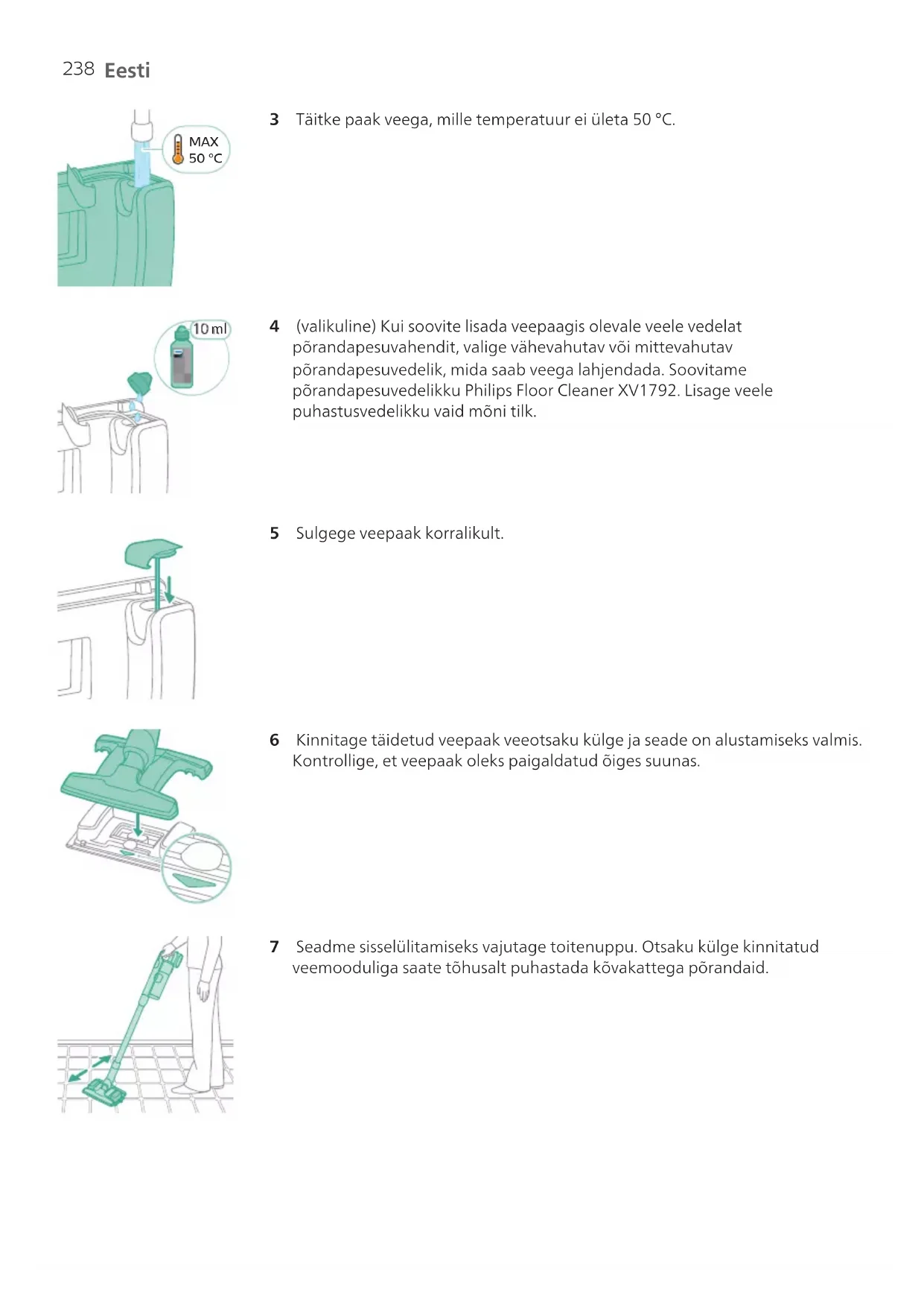 3 Seadme aku täislaadimiseks kulub 6 tundi. Laadimise edenemist saate jälgida ekraanil. Kui seade on täis laetud, süttib näidikul väärtus 100%. Mõne minuti pärast lülitub näidik välja. Seadme kasutamine Seadme kokkupanek 1 Kinnitage käeshoitav osa toru külge. Klõpsatus kinnitab, et osad on korralikult ühendatud. 2 Kinnitage toru otsaku külge. Klõpsatus kinnitab, et osad on korralikult ühendatud.236 Eesti Pehme ja kõva põrandapinna tolmuimejaga puhastamine 1 Seadme sisselülitamiseks vajutage toitenuppu. Märkus. Seadme väljalülitamiseks vajutage uuesti toitenuppu. 2 Kasutage + ja – nuppe, et valida kolme erineva võimsuse vahel: E – ecorežiim N – tavarežiim T – turborežiim 3 Tolmuimejaga saate puhastada nii kõva- kui ka pehme kattega põrandat. Kui põranda tüübi tuvastamise funktsioon on sisse lülitatud, tunneb seade ära põranda tüübi ja optimeerib automaatselt oma tööd valitud võimsuse piires. Selle funktsiooni väljalülitamiseks vt altpoolt, kuidas seadeid kohandada. Hoiatus! Ärge kunagi imege seadme sisse vett ega mõnda muud vedelikku.237 Eesti Ettevaatust! Ärge vaadake põlevaid LED-tulesid otse ega suunake neid kellelegi silma. LED-tuli on väga ere. Kõvakattega põrandalt tolmu imemine mopiga pesemise ajal Ettevaatust! Kasutage veepaaki ainult veekindla kattega (nt linoleum, emailplaadid ja lakitud parkett) kõvakattega põrandatel ning kivipõrandatel (nt marmor). Kui teie põrand ei ole veekindlaks töödeldud, küsige tootjalt, kas seda tohib veega puhastada. Ärge kasutage veepaaki kõvakattega põrandatel, mille veekindel kate on kahjustatud. Märkus. Ärge kasutage veepaaki vaipade puhastamiseks. Märkus. Ärge lükake veepaagiga seadet külgsuunas, sest nii jäävad põrandale veejäljed. Liigutage ainult edasi ja tagasi. 1 Tehke mikrokiust puhastuslapp enne kasutamist veega märjaks. 2 Kinnitage mikrokiust puhastuslapp veepaagi alla. Pange veepaagi all ja puhastuslapi tagumisel poolel olevad takjakinnitused kohakuti.238 Eesti MAX 50 °C 3 Täitke paak veega, mille temperatuur ei ületa 50°C. 10 ml 4 (valikuline) Kui soovite lisada veepaagis olevale veele vedelat põrandapesuvahendit, valige vähevahutav või mittevahutav põrandapesuvedelik, mida saab veega lahjendada. Soovitame põrandapesuvedelikku Philips Floor Cleaner XV1792. Lisage veele puhastusvedelikku vaid mõni tilk. 5 Sulgege veepaak korralikult. 6 Kinnitage täidetud veepaak veeotsaku külge ja seade on alustamiseks valmis. Kontrollige, et veepaak oleks paigaldatud õiges suunas. 7 Seadme sisselülitamiseks vajutage toitenuppu. Otsaku külge kinnitatud veemooduliga saate tõhusalt puhastada kõvakattega põrandaid.239 Eesti Märkus. Veemoodul ei sobi pehme kattega põrandate, näiteks vaipade puhastamiseks. Märkus. Ärge puhastage veeotsakuga, kui veepaak ei ole paigas. Ettevaatust! Veemoodulit ei tohi kasutada veeloikude kuivatamiseks. Nõuanded jm oluline teave
