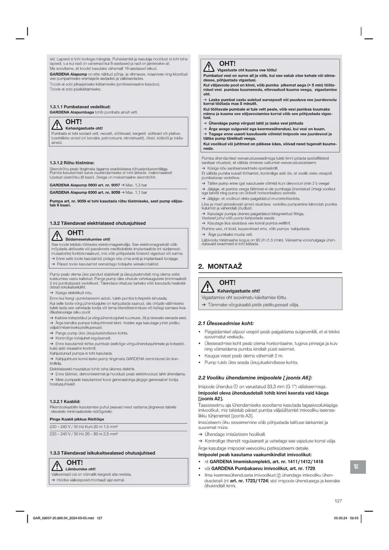 OHT! Südameseiskumise oht!See toode tekitab töötades elektromagnetvälja. See elektromagnetväli võib mõjutada aktiivsete või passiivsete meditsiiniliste implantaatide (nt südamesti-mulaatorite) funktsionaalsust, mis võib põhjustada tõsiseid vigastusi või surma. v Enne selle toote kasutamist pidage nõu oma arsti ja implantaadi tootjaga. v Pärast toote kasutamist eemaldage toitejuhe seinakontaktist.Pump peab olema üles pandud stabiilselt ja üleujutuskindlalt ning olema vette kukkumise vastu kaitstud. Pange pump üles ohutule vahekaugusele (minimaalselt 2m) pumbatavast vedelikust. Täiendava ohutuse tarbeks võib kasutada heakskii-detud isikukaitselülitit.v Küsige elektrikult nõu.Enne kui keegi ujumisbasseini astub, tuleb pumba toitepistik lahutada.Kui selle toote võrguühendusjuhe on kahjustada saanud, siis ohtude vältimiseks tuleb lasta see vahetada tootja või tema klienditeeninduse või kellegi sarnase kva-lifikatsiooniga isiku poolt.v Kaitske toitepistikut ja võrguühendusjuhet kuumuse, õli ja teravate servade eest.v Ärge kandke pumpa toitejuhtmest kinni hoides ega kasutage juhet pistiku väljatõmbamiseks pistiku pesast.v Pange pump üles üleujutuskindlasse kohta.v Kontrollige toitejuhet regulaarselt.v Enne kasutamist tehke pumbale (eelkõige võrguühendusjuhtmele ja toitepisti-kule) alati visuaalne kontroll.Kahjustunud pumpa ei tohi kasutada.v Kahjujuhtumi korral laske pump tingimata GARDENA teenindusel üle kon-trollida.Elektrialaseid muudatusi tohib teha üksnes elektrik.v Enne täitmist, demonteerimist ja hooldust peab elektrivoolust lahti ühendama.v Meie pumpade kasutamisel koos generaatoriga järgige generaatori tootja hoiatusjuhiseid.1.3.2.1 Kaablid:Pikenduskaablite kasutamise puhul peavad need vastama järgnevas tabelis olevatele minimaalsetele ristlõigetele:Pinge Kaabli pikkus Ristlõige230 – 240 V / 50 Hz Kuni 20 m 1,5 mm²230 – 240 V / 50 Hz 20 – 50 m 2,5 mm²
