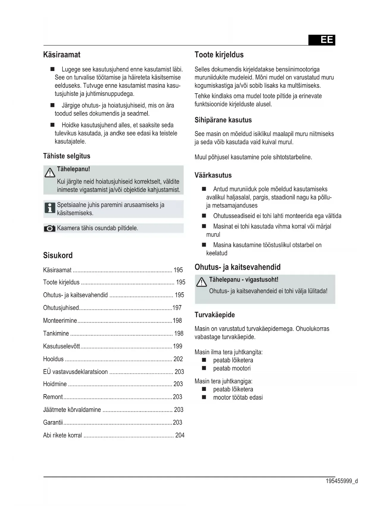 - Tarkasta niittoterät Jos ilmenneitä häiriöitä ei löydy tästä taulukosta tai jos et osaa itse korjata niitä, ota yhteyttä vastaavaan asiakaspalveluumme.EE 195455999_d Sisukord Käsiraamat ................................................................ 195 Toote kirjeldus ............................................................ 195 Ohutus- ja kaitsevahendid ......................................... 195 Ohutusjuhised ............................................................ 197 Monteerimine ............................................................. 198 Tankimine .................................................................. 198 Kasutuselevõtt ........................................................... 199 Hooldus ..................................................................... 202 EÜ vastavusdeklaratsioon ......................................... 203 Hoidmine ................................................................... 203 Remont ...................................................................... 203 Jäätmete kõrvaldamine ............................................. 203 Garantii ...................................................................... 203 Abi rikete korral .......................................................... 204 Käsiraamat Lugege see kasutusjuhend enne kasutamist läbi. See on turvalise töötamise ja häireteta käsitsemise eelduseks. Tutvuge enne kasutamist masina kasu- tusjuhiste ja juhtimisnuppudega. Järgige ohutus- ja hoiatusjuhiseid, mis on ära toodud selles dokumendis ja seadmel. Hoidke kasutusjuhend alles, et saaksite seda tulevikus kasutada, ja andke see edasi ka teistele kasutajatele. Tähiste selgitus Tähelepanu! Kui järgite neid hoiatusjuhiseid korrektselt, väldite inimeste vigastamist ja/või objektide kahjustamist. Spetsiaalne juhis paremini arusaamiseks ja käsitsemiseks. Kaamera tähis osundab piltidele. Toote kirjeldus Selles dokumendis kirjeldatakse bensiinimootoriga muruniidukite mudeleid. Mõni mudel on varustatud muru kogumiskastiga ja/või sobib lisaks ka multšimiseks. Tehke kindlaks oma mudel toote piltide ja erinevate funktsioonide kirjelduste alusel. Sihipärane kasutus See masin on mõeldud isiklikul maalapil muru niitmiseks ja seda võib kasutada vaid kuival murul. Muul põhjusel kasutamine pole sihtotstarbeline. Väärkasutus Antud muruniiduk pole mõeldud kasutamiseks avalikul haljasalal, pargis, staadionil nagu ka põllu- ja metsamajanduses Ohutusseadiseid ei tohi lahti monteerida ega vältida Masinat ei tohi kasutada vihma korral või märjal murul Masina kasutamine tööstuslikul otstarbel on keelatud Ohutus- ja kaitsevahendid Tähelepanu - vigastusoht! Ohutus- ja kaitsevahendeid ei tohi välja lülitada! Turvakäepide Masin on varustatud turvakäepidemega. Ohuolukorras vabastage turvakäepide. Masin ilma tera juhtkangita: peatab lõiketera peatab mootori Masin tera juhtkangiga: peatab lõiketera mootor töötab edasiEE Originaalse kasutusjuhendi tõlge Bensiinimootoriga muruniiduk1 Käivitusnöör 10 Vario-ajam*2 Peaülekanne* 11 Käsiraamat3 Turvakäepide 12 Väljaviskesüsteem*4 Ergonoomne kõrguse reguleerija* 13 Luuk*5 Täituvusnäidik* 14 Multšimiskiil*6 Klapp 15 Electric alustada süüde*7 Muru kogumiskast 16 Lühijuhend8 Lõikekõrguse reguleerija 17 Masina kaugjuhtimine*9 Tera juhtkang* * vastavalt mudelileMasina sümbolidTähelepanu!Ülim ettevaatlikkus käsitsemisel.Enne niitmist tõmmake masinaküljest süüteküünla juhe välja.Lugege enne kasutuselevõttu kasutusjuhend läbi!STARTElectric alustada süüde:Enne hooldus- ja remonditöid tuleb süütevõti eemaldada!Hoidke kõrvalseisjad ohupiirkonnast eemal!Lühijuhendabastage mootoripidur.Hoidke käed ja jalad masinast eemal!LühijuhendLülitage peaülekanne sisse.Hoidke ohupiirkonnast eemal.LühijuhendMasina kaugjuhtimine Start / Stopp.