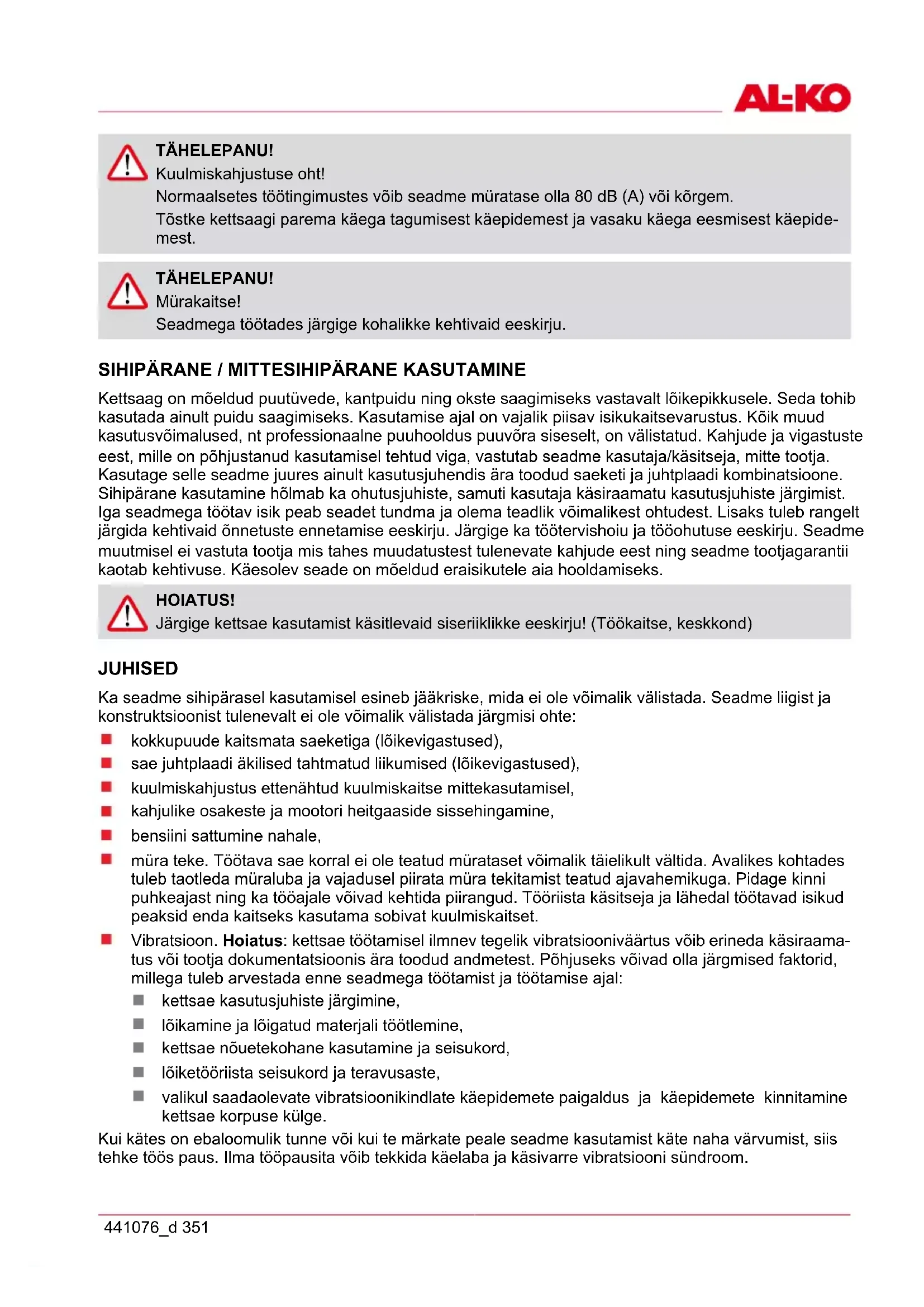 (2000/14/EÜ + 2005/88/EÜ) 112 dB (A) 113 dB (A)et Garantii 372 BKS 3835 / BKS 4040 GARANTII Võimalikud materjali- ja tootmisvead kõrvaldamine seadusega kehtestatud garantiiaja jooksul omal va- likul kas remondi või seadme asendamise teel. Garantii pikkus sõltub konkreetsest riigist, kust seade osteti. Meie garantii kehtib ainult järgmistel tingimustel seadme nõuetekohasel kasutamisel kasutusjuhendi järgimisel originaalvaruosade kasutamisel Garantii kaotab kehtivuse järgmisel juhul: seadme omavolilisel remontimisel seadme tehnilise modifitseerimise korral mitteotstarbekohane kasutamine (nt tööstusli- kul või kommertseesmärgil kasutmine Garantii ei kata: värvikahjustusi, mis tekivad normaalse kulumise käigus kuluvatele osadele, mis on varuosade kaardil tähistatud raamiga [xxx xxx (x)] sisepõlemismootorite jaoks kehtivad eraldi vastavate mootoritootjate garantiitingimused Garantii algab seadme ostmise kuupäeval esimese lõppkasutaja poolt. Loeb originaalostutšekil olev ku- upäev. Garantiijuhtumi korral pöörduge selle garantiisertifikaadi ja ostutšekiga oma edasimüüja poole või lähimasse volitatud klienditeenindusse. See garantii ei mõjuta ostja seaduslikku nõudeõigust müüja suhtes. EÜ VASTAVUSDEKLARATSIOON Sellega teatame, et see toode, mis on meie poolt selles versioonis turustatud, vastab EÜ-direktiividele, EÜ-ohutusstandarditele ja tootes- petsiifilistele normidele. Toode Tootja Esindaja Käsitsege Seerianumber G4104105 AL-KO Geräte GmbH Ichenhauser Str. 14 D-89359 Kötz Andreas Hedrich Ichenhauser Str. 14 D-89359 Kötz Typ EÜ-direktiivid Kooskõlla viidud normid BKS 3835 BKS 4040 Müratase EN ISO 3744 mõõdetud / tagatud BKS 3835 - 108 / 112 dB(A) BKS 4040 - 110 / 113 dB(A) 2006/42/EC 2014/30/EU 2000/14/EC