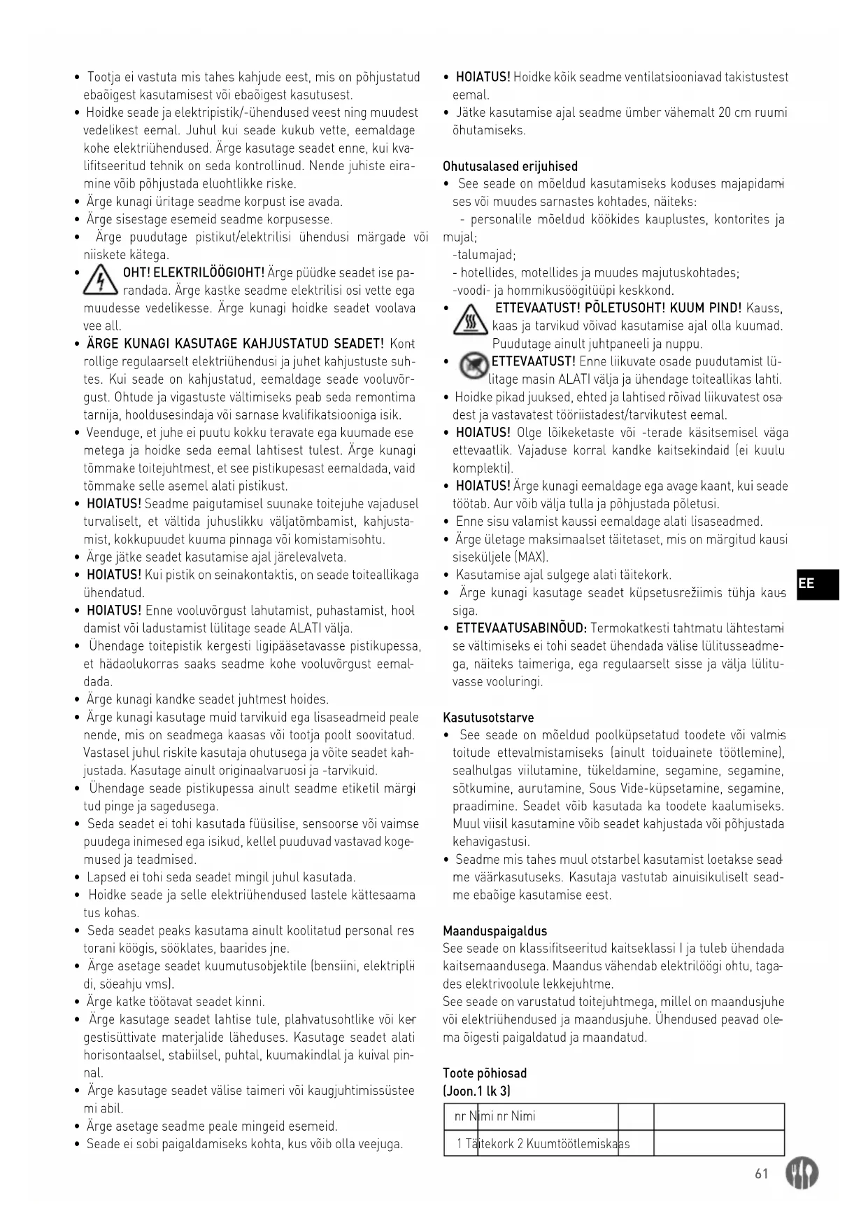 ma õigesti paigaldatud ja maandatud. Toote põhiosad (Joon.1 lk 3) nr Nimi nr Nimi 1 Täitekork 2 Kuumtöötlemiskaas62