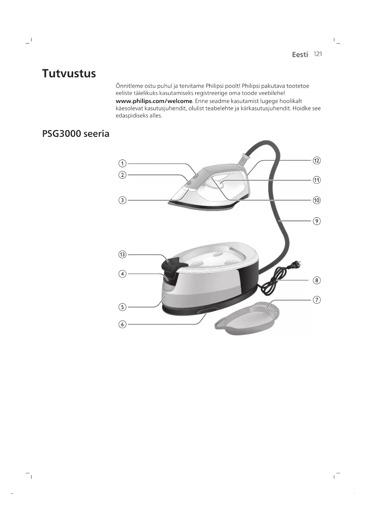 Eesti Tutvustus Õnnitleme ostu puhul ja tervitame Philipsi poolt! Philipsi pakutava tootetoeeeliste täielikuks kasutamiseks registreerige oma toode veebilehelwww.philips.com/welcome. Enne seadme kasutamist lugege hoolikaltkäesolevat kasutusjuhendit, olulist teabelehte ja kiirkasutusjuhendit. Hoidke seeedaspidiseks alles. PSG3000 seeria