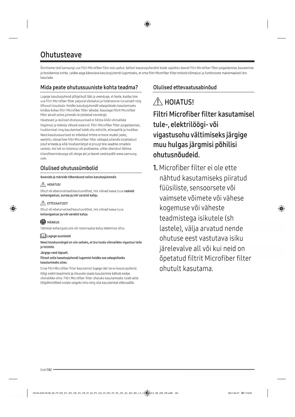 nähtud kasutamiseks piiratud füüsiliste, sensoorsete või vaimsete võimete või vähese kogemuse või väheste teadmistega isikutele (sh lastele), välja arvatud nende ohutuse eest vastutava isiku järelevalve all või kui neid on õpetatud filtrit Microfiber filter ohutult kasutama. DC68-04471B-00_IB_FT-MF_EU_EN_DE_NL_FR_IT_ES_PT_DA_FI_NO_SV_PL_HU_EL_RO_BG_LT_LV_ET_CS_SK_HR_TR.indb 182 2023-06-07 5:54:09Eesti 183