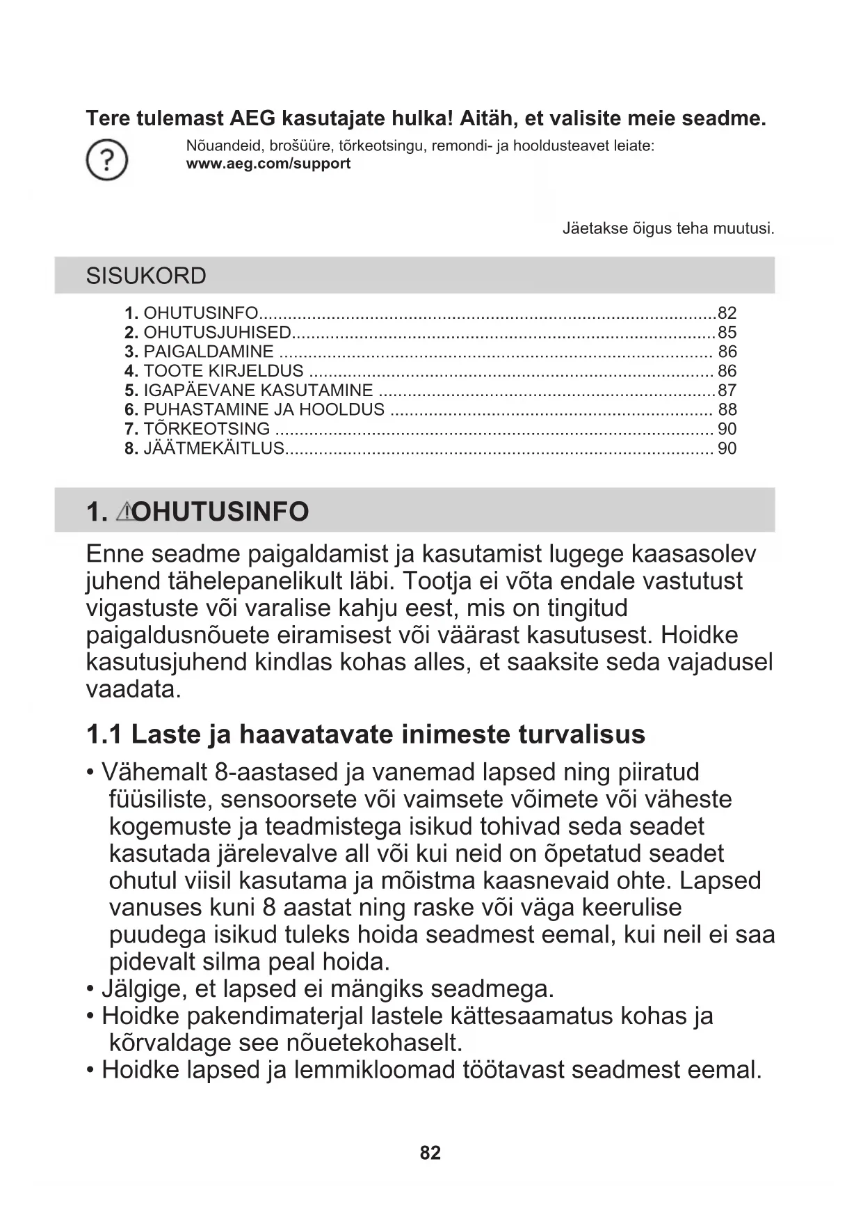- Vähemalt 8-aastased ja vanemad lapsed ning piiratud füüsiliste, sensoorsete või vaimsete võimete või väheste kogemuste ja teadmistega isikud tohivad seda seadet kasutada järelevalve all või kui neid on õpetatud seadet ohutul viisil kasutama ja mõistma kaasnevaid ohte. Lapsed vanuses kuni 8 aastat ning raske või väga keerulise puudega isikud tuleks hoida seadmest eemal, kui neil ei saa pidevalt silma peal hoida.