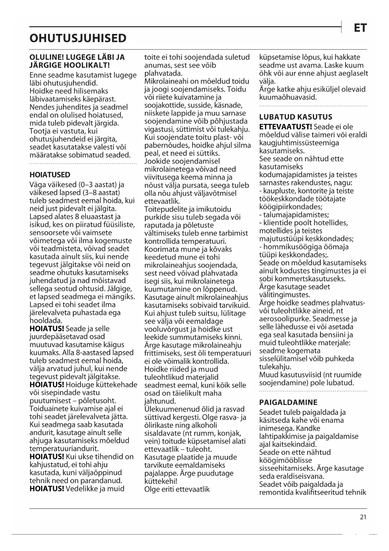 JÄRGIGE HOOLIKALT! Enne seadme kasutamist lugege läbi ohutusjuhendid. Hoidke need hilisemaks läbivaatamiseks käepärast. Nendes juhendites ja seadmel endal on olulised hoiatused, mida tuleb pidevalt järgida. Tootja ei vastuta, kui ohutusjuhendeid ei järgita, seadet kasutatakse valesti või määratakse sobimatud seaded. HOIATUSED Väga väikesed (0–3 aastat) ja väikesed lapsed (3–8 aastat) tuleb seadmest eemal hoida, kui neid just pidevalt ei jälgita. Lapsed alates 8 eluaastast ja isikud, kes on piiratud füüsiliste, sensoorsete või vaimsete võimetega või ilma kogemuste või teadmisteta, võivad seadet kasutada ainult siis, kui nende tegevust jälgitakse või neid on seadme ohutuks kasutamiseks juhendatud ja nad mõistavad sellega seotud ohtusid. Jälgige, et lapsed seadmega ei mängiks. Lapsed ei tohi seadet ilma järelevalveta puhastada ega hooldada. HOIATUS! Seade ja selle juurdepääsetavad osad muutuvad kasutamise käigus kuumaks. Alla 8-aastased lapsed tuleb seadmest eemal hoida, välja arvatud juhul, kui nende tegevust pidevalt jälgitakse. HOIATUS! Hoiduge küttekehade või sisepindade vastu puutumisest – põletusoht. Toiduainete kuivamise ajal ei tohi seadet järelevalveta jätta. Kui seadmega saab kasutada andurit, kasutage ainult selle ahjuga kasutamiseks mõeldud temperatuuriandurit. HOIATUS! Kui ukse tihendid on kahjustatud, ei tohi ahju kasutada, kuni väljaõppinud tehnik need on parandanud. HOIATUS! Vedelikke ja muid toite ei tohi soojendada suletud anumas, sest see võib plahvatada. Mikrolaineahi on mõeldud toidu ja joogi soojendamiseks. Toidu või riiete kuivatamine ja soojakottide, susside, käsnade, niiskete lappide ja muu sarnase soojendamine võib põhjustada vigastusi, süttimist või tulekahju. Kui soojendate toitu plast- või pabernõudes, hoidke ahjul silma peal, et need ei süttiks. Jookide soojendamisel mikrolainetega võivad need viivitusega keema minna ja nõust välja pursata, seega tuleb olla nõu ahjust väljavõtmisel ettevaatlik. Toitepudelite ja imikutoidu purkide sisu tuleb segada või raputada ja põletuste vältimiseks tuleb enne tarbimist kontrollida temperatuuri. Koorimata mune ja kõvaks keedetud mune ei tohi mikrolaineahjus soojendada, sest need võivad plahvatada isegi siis, kui mikrolainetega kuumutamine on lõppenud. Kasutage ainult mikrolaineahjus kasutamiseks sobivaid tarvikuid. Kui ahjust tuleb suitsu, lülitage see välja või eemaldage vooluvõrgust ja hoidke ust leekide summutamiseks kinni. Ärge kasutage mikrolaineahju frittimiseks, sest õli temperatuuri ei ole võimalik kontrollida. Hoidke riided ja muud tuleohtlikud materjalid seadmest eemal, kuni kõik selle osad on täielikult maha jahtunud. Ülekuumenenud õlid ja rasvad süttivad kergesti. Olge rasva- ja õlirikaste ning alkoholi sisaldavate (nt rumm, konjak, vein) toitude küpsetamisel alati ettevaatlik – tuleoht. Kasutage plaatide ja muude tarvikute eemaldamiseks pajalappe. Ärge puudutage küttekehi! Olge eriti ettevaatlik küpsetamise lõpus, kui hakkate seadme ust avama. Laske kuum õhk või aur enne ahjust aeglaselt välja. Ärge katke ahju esiküljel olevaid kuumaõhuavasid. LUBATUD KASUTUS ETTEVAATUST! Seade ei ole mõeldud välise taimeri või eraldi kaugjuhtimissüsteemiga kasutamiseks. See seade on nähtud ette kasutamiseks kodumajapidamistes ja teistes sarnastes rakendustes, nagu: - kaupluste, kontorite ja teiste töökeskkondade töötajate köögipiirkondades; - talumajapidamistes; - klientide poolt hotellides, motellides ja teistes majutustüüpi keskkondades; - hommikusöögiga öömaja tüüpi keskkondades;. Seade on mõeldud kasutamiseks ainult kodustes tingimustes ja ei sobi kommertskasutuseks. Ärge kasutage seadet välitingimustes. Ärge hoidke seadmes plahvatus- või tuleohtlikke aineid, nt aerosoolipurke. Seadmesse ja selle lähedusse ei või asetada ega seal kasutada bensiini ja muid tuleohtlikke materjale: seadme kogemata sisselülitamisel võib puhkeda tulekahju. Muud kasutusviisid (nt ruumide soojendamine) pole lubatud. PAIGALDAMINE Seadet tuleb paigaldada ja käsitseda kahe või enama inimesega. Kandke lahtipakkimise ja paigaldamise ajal kaitsekindaid. Seade on ette nähtud köögimööblisse sisseehitamiseks. Ärge kasutage seda eraldiseisvana. Seadet võib paigaldada ja remontida kvalifitseeritud tehnik22 vastavalt tootja juhistele ja kohalikele ohutuseeskirjadele. Ärge parandage ega asendage mõnda seadme osa, kui seda kasutusjuhendis otseselt ei soovitata! Lapsed ei tohi seadet paigaldada. Hoidke lapsed seadme paigaldamise ajal sellest eemal. Jälgige paigaldamise ajal, et pakkematerjalid (kilekotid, polüstüreenosad jne) ei satuks laste kätte. Veenduge pärast seadme lahtipakkimist, et see ei ole transportimisel kahjustada saanud. Probleemide esinemisel võtke ühendust edasimüüja või lähima teenindusega. Enne paigaldamist tuleb seade vooluvõrgust lahti ühendada. Jälgige paigaldamise ajal, et seade ei kahjustaks toitejuhet. Aktiveerige seade alles siis, kui paigaldamine on lõpetatud. Pärast paigaldamist ei tohiks seadme allosa enam olla ligipääsetav. Tehke mööblis kõik vajalikud sisselõiked enne ahju paigaldamist ja eemaldage kõik puulaastud ja saepuru. Nõutav vahe ahju ülaserva ja tööpinna vahel ei tohi olla takistatud. Eemaldage seade polüstüreenaluselt alles paigaldamisel. Ärge paigaldage seadet dekoratiivse ukse taha – tuleoht! Veenduge pärast seadme lahtipakkimist, et seadme uks sulgub korralikult. Probleemide esinemisel võtke ühendust edasimüüja või lähima teenindusega. ELEKTRIGA SEOTUD HOIATUSED Lähtuge paigaldamisel kehtivatest ohutuseeskirjadest; vajalik on kõiki poolusi lahutav lahklüliti vähima kontaktivahega 3 mm ja seade peab olema maandatud. Kui voolujuhe on kahjustatud, vahetage see täpselt samasuguse vastu välja. Toitejuhet tohib vahetada ainult kvalifitseeritud tehnik vastavalt tootja juhistele ja kehtivatele ohutuseeskirjadele. Võtke ühendust volitatud teenindusega.