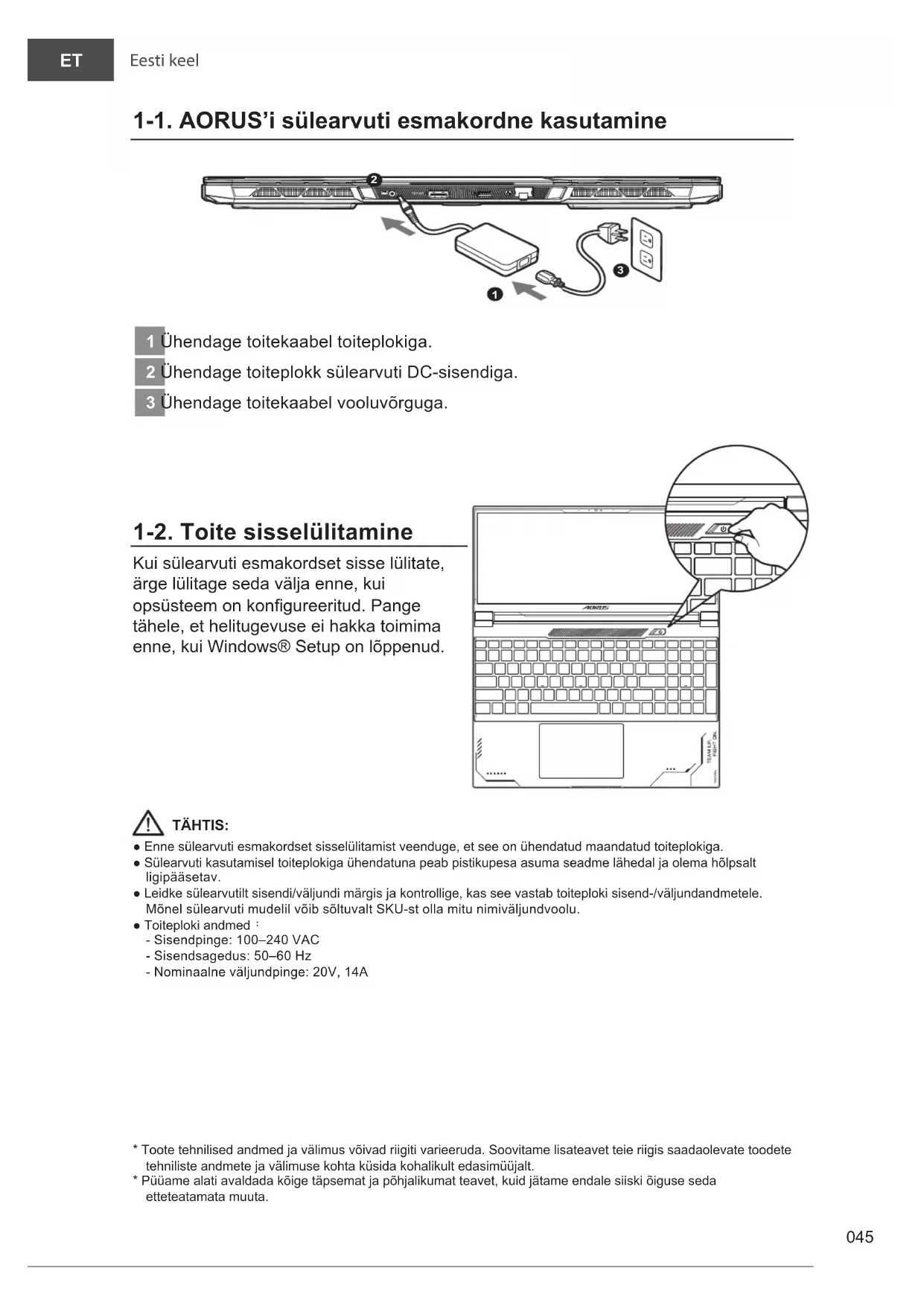 1-1. AORUS’i sülearvuti esmakordne kasutamine DCIN