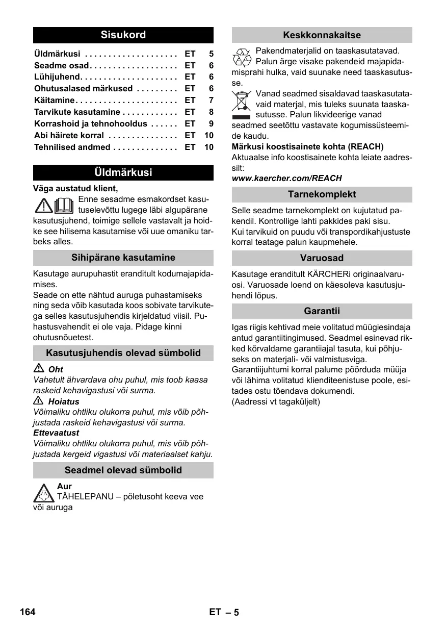 Üldmärkusi Pakendmaterjalid on taaskasutatavad. Palun ärge visake pakendeid majapidamisprahi hulka, vaid suunake need taaskasutusse. Vanad seadmed sisaldavad taaskasutatavaid materjal, mis tuleks suunata taaskasutusse. Palun likvideerige vanad seadmed seetõttu vastavate kogumissüsteemide kaudu. Märkusi koostisainete kohta (REACH) Aktuaalse info koostisainete kohta leiate aadressilt: www.kaercher.com/REACH Väga austatud klient, Enne sesadme esmakordset kasutuselevõttu lugege läbi algupärane kasutusjuhend, toimige sellele vastavalt ja hoidke see hilisema kasutamise või uue omaniku tarbeks alles. Selle seadme tarnekomplekt on kujutatud pakendil. Kontrollige lahti pakkides paki sisu. Kui tarvikuid on puudu või transpordikahjustuste korral teatage palun kaupmehele. Sihipärane kasutamine Varuosad Kasutage aurupuhastit eranditult kodumajapidamises. Seade on ette nähtud auruga puhastamiseks ning seda võib kasutada koos sobivate tarvikutega selles kasutusjuhendis kirjeldatud viisil. Puhastusvahendit ei ole vaja. Pidage kinni ohutusnõuetest. Kasutusjuhendis olevad sümbolid Oht Vahetult ähvardava ohu puhul, mis toob kaasa raskeid kehavigastusi või surma. 몇 Hoiatus Võimaliku ohtliku olukorra puhul, mis võib põhjustada raskeid kehavigastusi või surma. Ettevaatust Võimaliku ohtliku olukorra puhul, mis võib põhjustada kergeid vigastusi või materiaalset kahju. Tarnekomplekt Kasutage eranditult KÄRCHERi originaalvaruosi. Varuosade loend on käesoleva kasutusjuhendi lõpus. Garantii Igas riigis kehtivad meie volitatud müügiesindaja antud garantiitingimused. Seadmel esinevad rikked kõrvaldame garantiiajal tasuta, kui põhjuseks on materjali- või valmistusviga. Garantiijuhtumi korral palume pöörduda müüja või lähima volitatud klienditeenistuse poole, esitades ostu tõendava dokumendi. (Aadressi vt tagaküljelt) Seadmel olevad sümbolid Aur TÄHELEPANU – põletusoht keeva vee või auruga