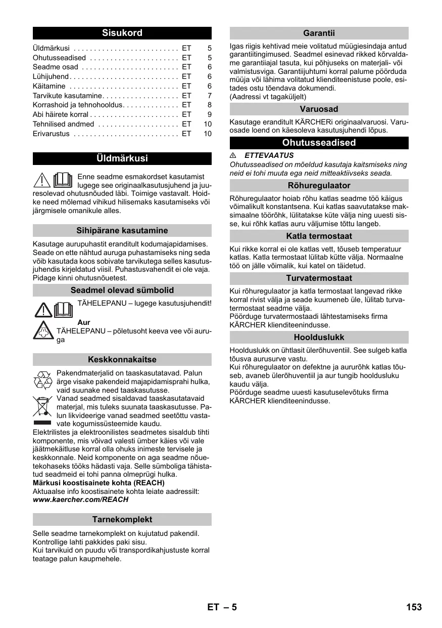 Üldmärkusi Enne seadme esmakordset kasutamist lugege see originaalkasutusjuhend ja juuresolevad ohutusnõuded läbi. Toimige vastavalt. Hoidke need mõlemad vihikud hilisemaks kasutamiseks või järgmisele omanikule alles. Sihipärane kasutamine Kasutage aurupuhastit eranditult kodumajapidamises. Seade on ette nähtud auruga puhastamiseks ning seda võib kasutada koos sobivate tarvikutega selles kasutusjuhendis kirjeldatud viisil. Puhastusvahendit ei ole vaja. Pidage kinni ohutusnõuetest. Seadmel olevad sümbolid TÄHELEPANU – lugege kasutusjuhendit! Aur TÄHELEPANU – põletusoht keeva vee või auruga Keskkonnakaitse Pakendmaterjalid on taaskasutatavad. Palun ärge visake pakendeid majapidamisprahi hulka, vaid suunake need taaskasutusse. Vanad seadmed sisaldavad taaskasutatavaid materjal, mis tuleks suunata taaskasutusse. Palun likvideerige vanad seadmed seetõttu vastavate kogumissüsteemide kaudu. Elektrilistes ja elektroonilistes seadmetes sisaldub tihti komponente, mis võivad valesti ümber käies või vale jäätmekäitluse korral olla ohuks inimeste tervisele ja keskkonnale. Neid komponente on aga seadme nõuetekohaseks tööks hädasti vaja. Selle sümboliga tähistatud seadmeid ei tohi panna olmeprügi hulka. Märkusi koostisainete kohta (REACH) Aktuaalse info koostisainete kohta leiate aadressilt: www.kaercher.com/REACH Igas riigis kehtivad meie volitatud müügiesindaja antud garantiitingimused. Seadmel esinevad rikked kõrvaldame garantiiajal tasuta, kui põhjuseks on materjali- või valmistusviga. Garantiijuhtumi korral palume pöörduda müüja või lähima volitatud klienditeenistuse poole, esitades ostu tõendava dokumendi. (Aadressi vt tagaküljelt) Varuosad Kasutage eranditult KÄRCHERi originaalvaruosi. Varuosade loend on käesoleva kasutusjuhendi lõpus. Ohutusseadised 몇 ETTEVAATUS Ohutusseadised on mõeldud kasutaja kaitsmiseks ning neid ei tohi muuta ega neid mitteaktiivseks seada. Rõhuregulaator Rõhuregulaator hoiab rõhu katlas seadme töö käigus võimalikult konstantsena. Kui katlas saavutatakse maksimaalne töörõhk, lülitatakse küte välja ning uuesti sisse, kui rõhk katlas auru väljumise tõttu langeb. Katla termostaat Kui rikke korral ei ole katlas vett, tõuseb temperatuur katlas. Katla termostaat lülitab kütte välja. Normaalne töö on jälle võimalik, kui katel on täidetud. Turvatermostaat Kui rõhuregulaator ja katla termostaat langevad rikke korral rivist välja ja seade kuumeneb üle, lülitab turvatermostaat seadme välja. Pöörduge turvatermostaadi lähtestamiseks firma KÄRCHER klienditeenindusse. Hoolduslukk Hoolduslukk on ühtlasit ülerõhuventiil. See sulgeb katla tõusva aurusurve vastu. Kui rõhuregulaator on defektne ja aururõhk katlas tõuseb, avaneb ülerõhuventiil ja aur tungib hooldusluku kaudu välja. Pöörduge seadme uuesti kasutuselevõtuks firma KÄRCHER klienditeenindusse. Tarnekomplekt Selle seadme tarnekomplekt on kujutatud pakendil. Kontrollige lahti pakkides paki sisu. Kui tarvikuid on puudu või transpordikahjustuste korral teatage palun kaupmehele. ET – 5
