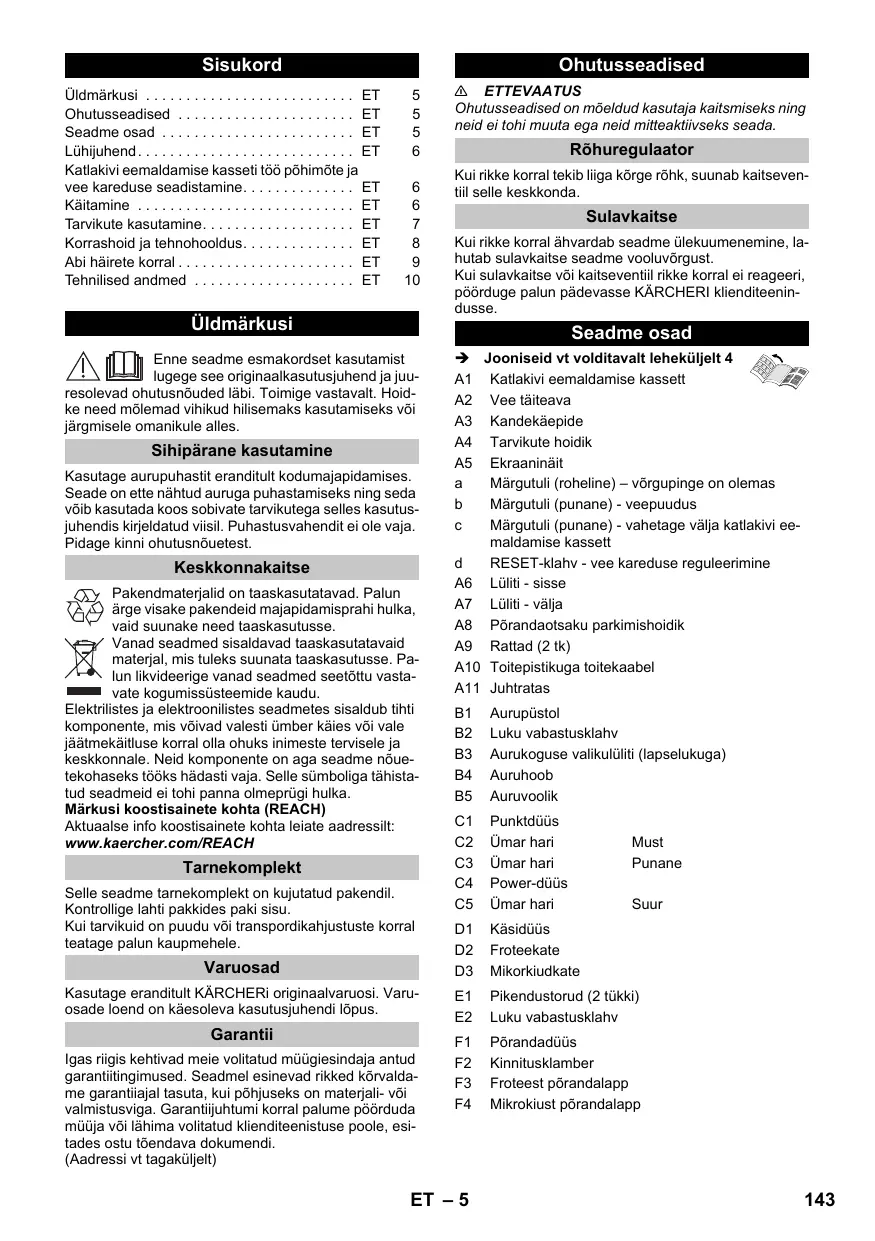 Kasutage eranditult KARCHERi originaalvaruosi. Varu-osade loend on kaesoleva kasutusjuhendi Iopus.
