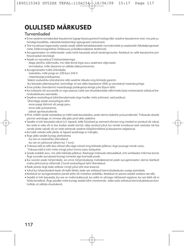 OLULISED MÄRKUSED Turvanõuded • Enne seadme esmakordset kasutamist lugege kasutusjuhend hoolega läbi: seadme kasutamine viisil, mis pole juhendiga kooskõlas, vabastab kaubamärgi igasugusest vastutusest. • Teie turvalisuse tagamiseks vastab seade sellele kohaldatavatele normatiividele ja seadustele (Madalpingeseadmete, Elektromagnetilise Ühilduvuse ja Keskkonnakaitse direktiivid). • Aurugeneraator on elektriseade: seda tohib kasutada ainult tavatingimustes. Keelatud on selle kasutamine professionaalsel eesmärgil. • Seade on varustatud 2 kaitsesüsteemiga: - klapp ülerõhu vältimiseks, mis rikke korral liigse auru seadmest välja laseb, - termokaitse, mille ülesanne on vältida ülekuumenemist. • Aurugeneraator tuleb ühendada: - toitevõrku, mille pinge on 220 kuni 240 V. - maandusega pistikupessa. Valesti vooluvõrku ühendamine võib seadme rikkuda ning tühistab garantii. Kui kasutate pikendusjuhet, kontrollige, et see oleks bipolaarne (I0A) ja varustatud maandusjuhiga. • Enne pistiku ühendamist maandusega pistikupessa kerige juhe lõpuni lahti. • Kui toitejuhe või auruvoolik on viga saanud, tuleb see ohuolukordade vältimiseks lasta viivitamatult volitatud teeninduskeskuses asendada. • Seadme vooluvõrgust lahtiühendamiseks ärge hoidke mitte juhtmest, vaid pistikust. Ühendage seade vooluvõrgust lahti: - enne paagi täitmist või paagi pesu, - enne selle puhastamist, - pärast iga kasutuskorda. • Pind, millele seade asetatakse ja millel seda kasutatakse, peab olema stabiilne ja kuumakindel. Triikrauda alusele pannes veenduge, et viimase alla jääv pind oleks stabiilne. • Seadet ei tohi kasutada isikud (s.h. lapsed), kelle füüsilised ja vaimsed võimed ning meeled on piiratud või isikud, kes seda ei oska või ei tea, kuidas seade toimib, välja arvatud juhul, kui nende turvalisuse eest vastutav isik kas nende järele valvab või on neile eelnevalt seadme tööpõhimõtteid ja kasutamist selgitanud. • Ka tuleb valvata selle järele, et lapsed seadmega ei mängiks. • Ärge jätke seadet kunagi järelvalveta: - kui see on vooluvõrku ühendatud, - kui see on jahtunud vähem kui 1 tund. • Triikraua tald ja selle alus võivad olla väga tulised ning tekitada põletusi: ärge puutuge nende vastu. Triikraua tald ei tohi mitte mingil juhul minna vastu toitejuhet. • Seade eraldab auru, mis võib tekitada põletusi. Käsitsege triikrauda ettevaalikult, eriti vertikaalse triikimise korral. Ärge suunake auruavasid kunagi inimeste ega loomade poole. • Kui soovite paaki tühjendada, siis enne tühjenduskorgi mahakeeramist peab aurugeneraator olema täielikult maha jahtunud ja vähemalt 2 tundi vooluvõrgust lahti ühendatud. • Paaki pestes ärge laske sellesse mingil juhul vett otse kraanist. • Juhul kui tühjenduskork kaob või katki läheb, laske see volitatud teeninduskeskuses uuega asendada. • Keelatud on aurugeneraatori panek vette või mistahes vedelikku. Keelatud on panna seadet voolava vee alla. • Seadet ei tohi kasutada, kui see on maha kukkunud, kui sellel on silmaga nähtavaid vigastusi, kui see lekib või ei tööta korralikult. Ärge püüdke mitte kunagi seadet lahti monteerida : laske seda volitatud teeninduskeskuses kontrollida, et vältida ohuolukordi.