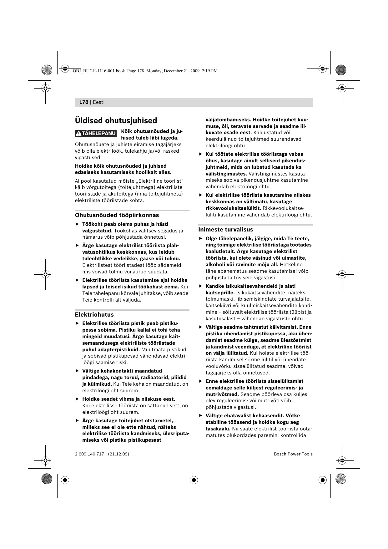 178 | Eesti Üldised ohutusjuhised PNEU Kôik ohutusnôuded ja ju- hised tuleb läbi lugeda. Ohutusnôuete ja juhiste eiramise tagajärjeks vôib olla elektrilôôk, tulekahju ja/vôi rasked vigastused. Hoidke kôik ohutusnôuded ja juhised edasiseks kasutamiseks hoolikalt alles. Allpool kasutatud môiste ,Elektriline tôêriist" käib vôrgutoitega (toitejuhtmega) elektriliste iistade ja akutoitega (ilma toitejuhtmeta) elektriliste téüriistade kohta. Ohutusnôuded tôôpiirkonnas > Tôëkoht peab olema puhas ja hästi valgustatud. Téôkohas valitsev segadus ja hämarus vôib pôhjustada ônnetusi. Ârge kasutage elektrilist tôôriista plah- vatusohtlikus keskkonnas, kus leidub tuleohtlikke vedelikke, gaase vüi tolmu. Elektrilistest tôbriistadest 166b sädemeid, mis vôivad tolmu vôi aurud süüdata.