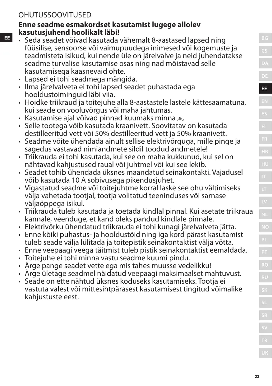 Ohutussoovitused Enne seadme esmakordset kasutamist lugege allolev kasutusjuhend hoolikalt läbi! • Seda seadet võivad kasutada vähemalt 8-aastased lapsed ning füüsilise, sensoorse või vaimupuudega inimesed või kogemuste ja teadmisteta isikud, kui nende üle on järelvalve ja neid juhendatakse seadme turvalise kasutamise osas ning nad mõistavad selle kasutamisega kaasnevaid ohte. • Lapsed ei tohi seadmega mängida. • Ilma järelvalveta ei tohi lapsed seadet puhastada ega hooldustoiminguid läbi viia. • Hoidke triikraud ja toitejuhe alla 8-aastastele lastele kättesaamatuna, kui seade on vooluvõrgus või maha jahtumas. • Kasutamise ajal võivad pinnad kuumaks minna . • Selle tootega võib kasutada kraanivett. Soovitatav on kasutada destilleeritud vett või 50% destilleeritud vett ja 50% kraanivett. • Seadme võite ühendada ainult sellise elektrivõrguga, mille pinge ja sagedus vastavad nimiandmete sildil toodud andmetele! • Triikrauda ei tohi kasutada, kui see on maha kukkunud, kui sel on nähtavad kahjustused raual või juhtmel või kui see lekib. • Seadet tohib ühendada üksnes maandatud seinakontakti. Vajadusel võib kasutada 10 A sobivusega pikendusjuhet. • Vigastatud seadme või toitejuhtme korral laske see ohu vältimiseks välja vahetada tootjal, tootja volitatud teeninduses või sarnase väljaõppega isikul. • Triikrauda tuleb kasutada ja toetada kindlal pinnal. Kui asetate triikraua kannale, veenduge, et kand oleks pandud kindlale pinnale. • Elektrivõrku ühendatud triikrauda ei tohi kunagi järelvalveta jätta. • Enne kõiki puhastus- ja hooldustöid ning iga kord pärast kasutamist tuleb seade välja lülitada ja toitepistik seinakontaktist välja võtta. • Enne veepaagi veega täitmist tuleb pistik seinakontaktist eemaldada. • Toitejuhe ei tohi minna vastu seadme kuumi pindu. • Ärge pange seadet vette ega mis tahes muusse vedelikku! • Ärge ületage seadmel näidatud veepaagi maksimaalset mahtuvust. • Seade on ette nähtud üksnes koduseks kasutamiseks. Tootja ei vastuta valest või mittesihtpärasest kasutamisest tingitud võimalike kahjustuste eest.