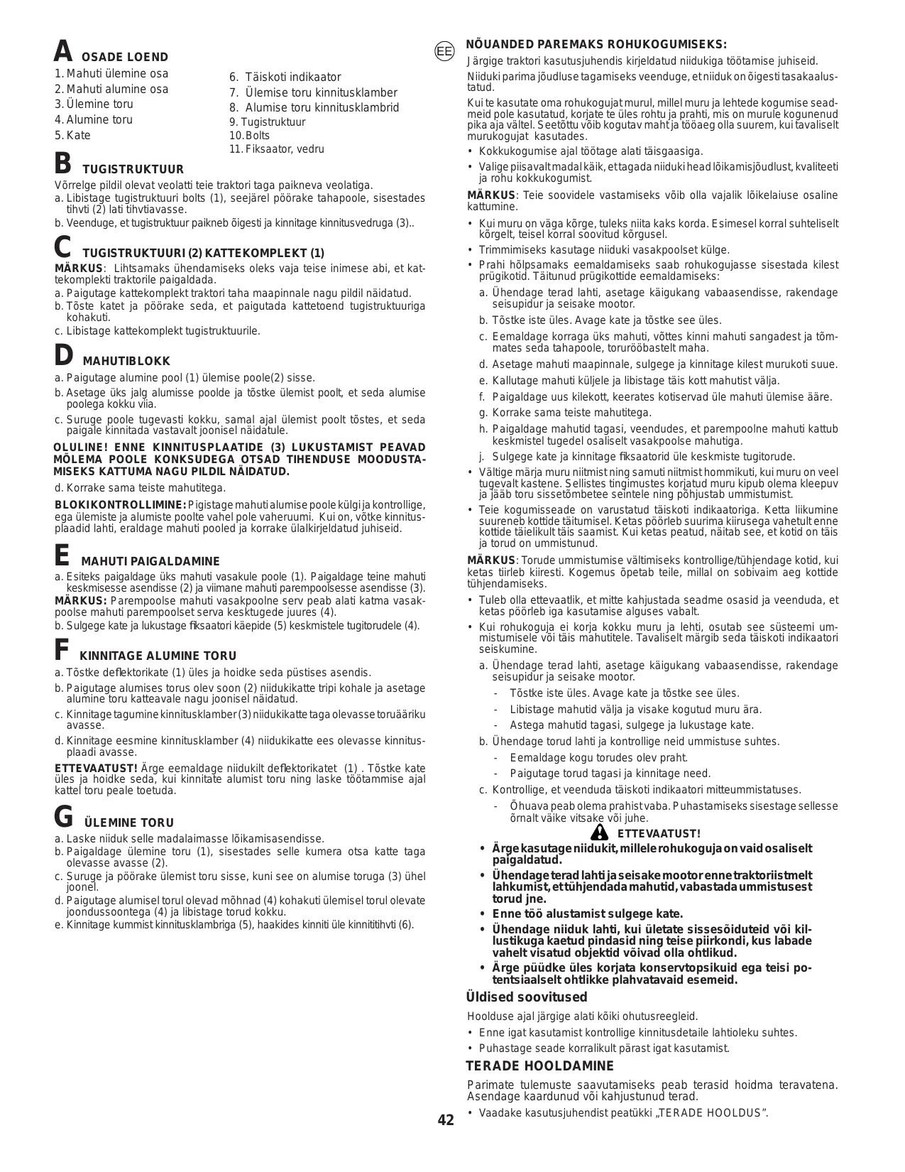 • Nunca haga funcionar la máquina dentro de un área cerrada donde gases peligrosos de óxido de carbono pueden acumularse. • Acuérdese que no hay pendiente segura. Hay que tener mucho cuidado cuando se quiere desplazar sobre pendientes de césped. Para protejerse contra vuelco; - evite arrancar o parar cuando vaya cuesta arriba o cuesta abajo; - enganche el embrague lentamente, siempre guarde la maquina en engranaje, especialmente cuanto se este desplazando cuesta abajo; - las velocidades de la maquina deben ser mantenidas bajas cuando este sobre las pendientes o cuando haga vueltas estrechas. - fíjese si hay agujeros, surcos o otros peligros escondidos; - nunca siegue al través de la cara de la pendiente, a menos que la segadora este diseñada para este propósito. • Tenga mucho cuidado cuando este tirando cargas o cuando este usando un equipo pesado. - Use solamente puntos de enganche de la barra de tracción. - Limite carga a esos que pueda controlar con seguridad. - No haga vuelta rápidas. Tenga cuidado cuando vaya marcha atrás. - Use contrapesos o pesos de rueda cuando este sugerido en su libro de instrucciones. • Tenga un cuidado extra cuando atraviese o se acerque de carreteras . • Pare la rotación de las cuchillas cuando ataviase superficies otras que césped. • Cuando use cualquier accesorio, nunca directa la descarga de materiales hacia personas que estén cerca y no permita que nadie cerca de la maquina cuando esta funcionando. • Nunca use la maquina sin la protección contra la descarga en su sitio • Nunca cambie los ajustes del regulador o no haga que el motor tenga una velocidad excesiva. • Antes de dejar la posición del operador: - desenganche la fuerza motriz y baje los accesorios; - cambie a neutro y enganche el freno de estacionamiento; - pare el motor y remueva la llave. • Desenganche la transmisión a los accesorios, pare el motor, y desconecte el (los) cable (s) de la bujía o remueva la llave de ignición - antes de limpiar bloqueos o desatrancar del conducto; - antes de inspeccionar, limpiar o trabajar sobre la segadora; - después de golpear un objeto extraño. Inspeccione la segadora cuidadosamente, para verificar si hay daños y haga reparaciones antes de volver a arrancar y a operar el equipo; - si la maquina empieza a vibrar anormalmente (verifíquela inmediatamente). • Desenganche la transmisión a los accesorios cuando haga el transporte o cuando no este en uso. • Pare el motor y desenganche la transmisión a los accesorios - antes de agregar combustible; - antes de quitar el recogedor del césped; - antes de haces ajustes de altura a menos que los ajustes pueden ser hechos de la posición del operador. • Reduzca los ajustes de la aceleración durante el tiempo que el motor se apague, si el motor viene diseñado con una válvula de apagado, sierre el combustible cuando halla terminado de segar.