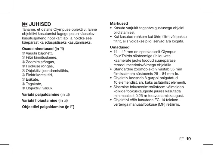 Märkused • Kasuta varjukit tagantvalgustusega objekti pildistamisel. • Kui kasutad rohkem kui ühte filtrit või paksu filtrit, siis võidakse pildi servad ära lõigata. Omadused • 14 – 42 mm on spetsiaalselt Olympus Four Thirds süsteemiga ühilduvate kaamerate jaoks loodud suurepärase reprodutseerimisvõimega objektiiv. • Standardne zoomobjektiiv vastab 35 mm filmikaamera süsteemis 28 – 84 mm-le. • Objektiiv koosneb 8 gurppi paigutatud 10 elemendist, sh. kaks asfäärilist elementi. • Sisemine fokuseerimissüsteem võimaldab kõikide fookuskauguste juures kasutada minimaalselt 0,25 m teravustamiskaugust. • Objektiivi võib kasutada EC-14 telekonverteriga manuaalfookuse (MF) režiimis.