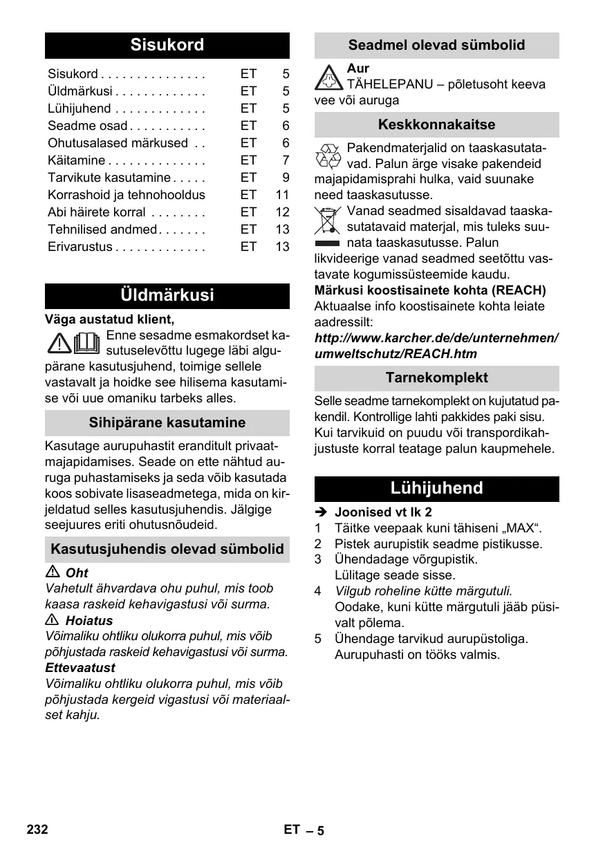 Aur TÄHELEPANU – põletusoht keeva vee või auruga Keskkonnakaitse Pakendmaterjalid on taaskasutatavad. Palun ärge visake pakendeid majapidamisprahi hulka, vaid suunake need taaskasutusse. Vanad seadmed sisaldavad taaskasutatavaid materjal, mis tuleks suunata taaskasutusse. Palun likvideerige vanad seadmed seetõttu vastavate kogumissüsteemide kaudu. Märkusi koostisainete kohta (REACH) Aktuaalse info koostisainete kohta leiate aadressilt: http://www.karcher.de/de/unternehmen/ umweltschutz/REACH.htm Tarnekomplekt Selle seadme tarnekomplekt on kujutatud pakendil. Kontrollige lahti pakkides paki sisu. Kui tarvikuid on puudu või transpordikahjustuste korral teatage palun kaupmehele. Lühijuhend