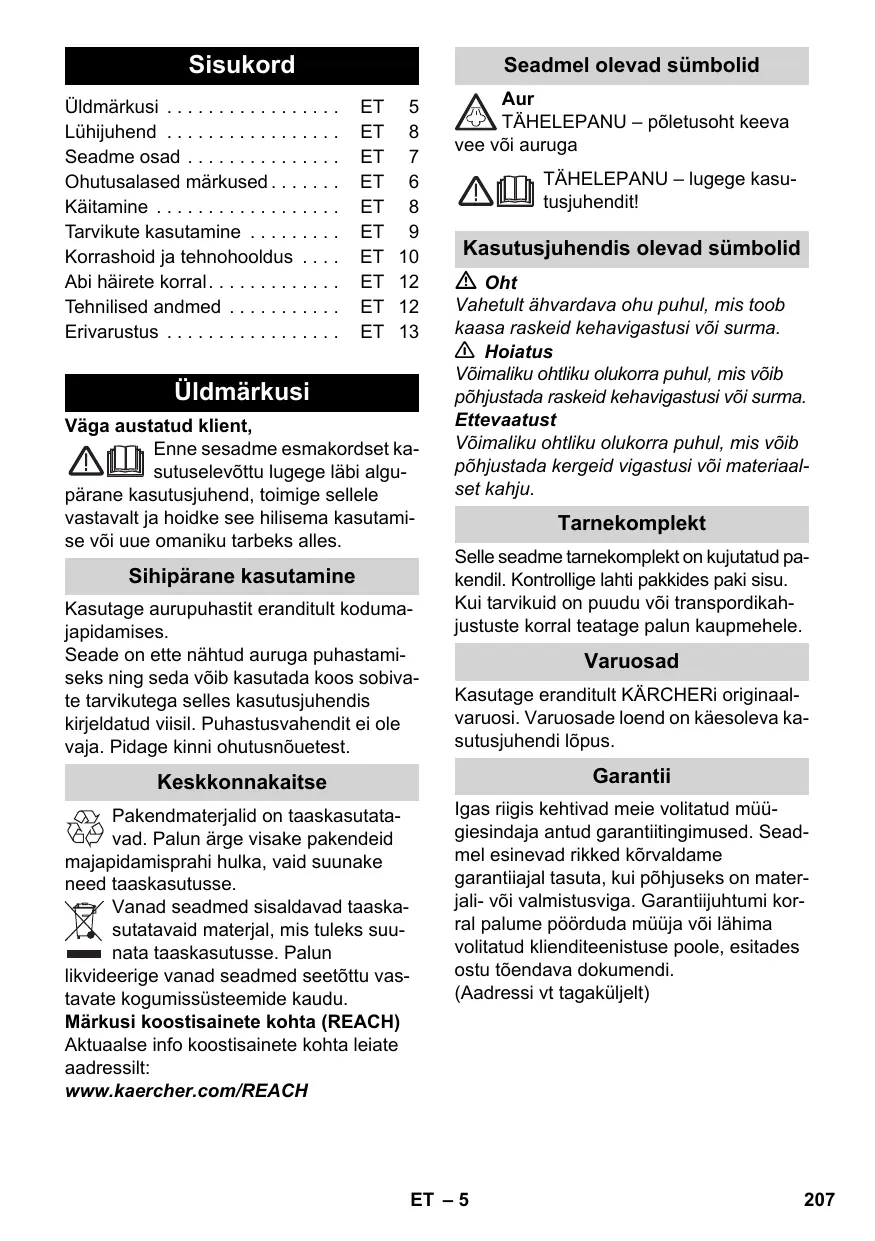 Üldmärkusi Väga austatud klient, Enne sesadme esmakordset kasutuselevõttu lugege läbi algupärane kasutusjuhend, toimige sellele vastavalt ja hoidke see hilisema kasutamise või uue omaniku tarbeks alles. Sihipärane kasutamine Kasutage aurupuhastit eranditult kodumajapidamises. Seade on ette nähtud auruga puhastamiseks ning seda võib kasutada koos sobivate tarvikutega selles kasutusjuhendis kirjeldatud viisil. Puhastusvahendit ei ole vaja. Pidage kinni ohutusnõuetest. Aur TÄHELEPANU – põletusoht keeva vee või auruga TÄHELEPANU – lugege kasutusjuhendit! Kasutusjuhendis olevad sümbolid Oht Vahetult ähvardava ohu puhul, mis toob kaasa raskeid kehavigastusi või surma. 몇 Hoiatus Võimaliku ohtliku olukorra puhul, mis võib põhjustada raskeid kehavigastusi või surma. Ettevaatust Võimaliku ohtliku olukorra puhul, mis võib põhjustada kergeid vigastusi või materiaalset kahju. Tarnekomplekt Selle seadme tarnekomplekt on kujutatud pakendil. Kontrollige lahti pakkides paki sisu. Kui tarvikuid on puudu või transpordikahjustuste korral teatage palun kaupmehele. Varuosad Kasutage eranditult KÄRCHERi originaalvaruosi. Varuosade loend on käesoleva kasutusjuhendi lõpus. Keskkonnakaitse Garantii Pakendmaterjalid on taaskasutatavad. Palun ärge visake pakendeid majapidamisprahi hulka, vaid suunake need taaskasutusse. Vanad seadmed sisaldavad taaskasutatavaid materjal, mis tuleks suunata taaskasutusse. Palun likvideerige vanad seadmed seetõttu vastavate kogumissüsteemide kaudu. Märkusi koostisainete kohta (REACH) Aktuaalse info koostisainete kohta leiate aadressilt: www.kaercher.com/REACH Igas riigis kehtivad meie volitatud müügiesindaja antud garantiitingimused. Seadmel esinevad rikked kõrvaldame garantiiajal tasuta, kui põhjuseks on materjali- või valmistusviga. Garantiijuhtumi korral palume pöörduda müüja või lähima volitatud klienditeenistuse poole, esitades ostu tõendava dokumendi. (Aadressi vt tagaküljelt) ET – 5