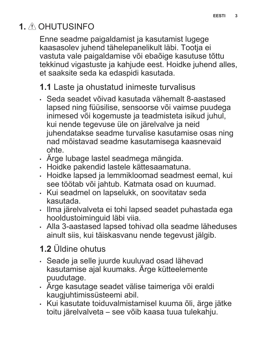 Seda seadet võivad kasutada vähemalt 8-aastased lapsed ning füüsilise, sensoorse või vaimse puudega inimesed või kogemuste ja teadmisteta isikud juhul, kui nende tegevuse üle on järelvalve ja neid juhendatakse seadme turvalise kasutamise osas ning nad mõistavad seadme kasutamisega kaasnevaid ohte. Ärge lubage lastel seadmega mängida. Hoidke pakendid lastele kättesaamatuna. Hoidke lapsed ja lemmikloomad seadmest eemal, kui see töötab või jahtub. Katmata osad on kuumad. Kui seadmel on lapselukk, on soovitatav seda kasutada. Ilma järelvalveta ei tohi lapsed seadet puhastada ega hooldustoiminguid läbi viia. Alla 3-aastased lapsed tohivad olla seadme läheduses ainult siis, kui täiskasvanu nende tegevust jälgib.