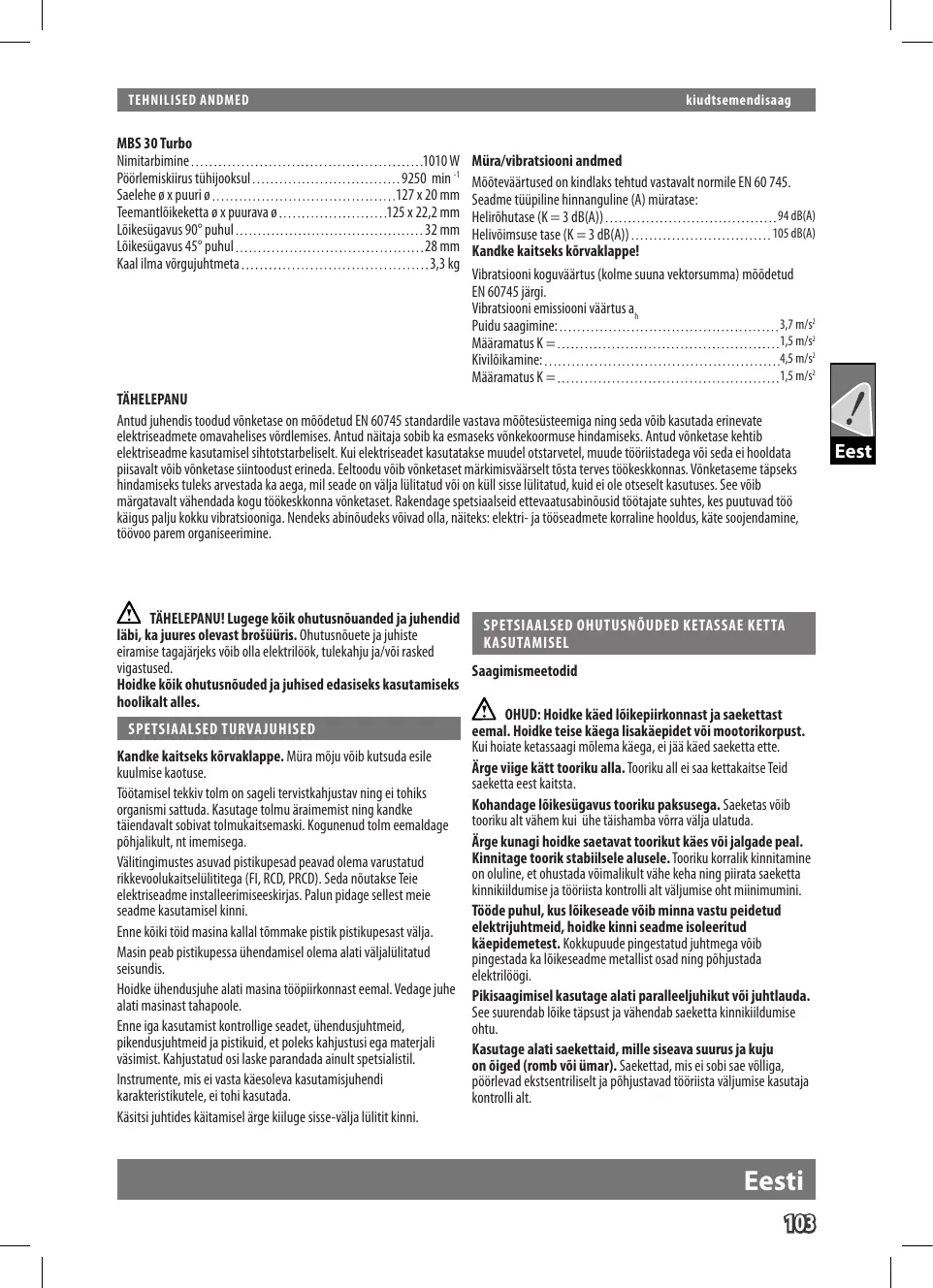 TEHNILISED ANDMED kiudtsemendisaag MBS 30 Turbo Nimitarbimine 1010W Péôrlemiskirustühioksul 9250 min Saelehe x puuri 9 12720 mm Teemantlôlkeketta 9x puurava 0. 125%22,2mm Lôlkesgavus 90 pubul 32m Lôkesüigavus 45° puhul L28mm Kaal ma vôrgujuhtmeta…… -33kg TÂHELEPANU Müra/vibratsiooni andmed Müôtevéärtused on kindlaks tehtud vastavaltnormile EN 60 745. Seadme tüüpiline hinnanguline (A) müratase: Helirôhutase (K= 3 dB(A)) Helivôimsuse tase (K = 3 dB(A)) Kandke kaitseks kôrvaklappe! Vibratsiooni koguvéärtus (kolme suuna vektorsumma) môdetud EN 60745 järg. Vibratsiooni emissiooni väärtus à, 94 dB(4) 105 dB(A) Puidu saagimine: 37 ms Méääramatus K 15m Kivilôikamine: L.45m8 Méääramatus K = 15 ms Antud juhendis toodud vônketase on môôdetud EN 60745 standardile vastave môôtesüisteemiga ing seda vôb kasutada erinevate elektriseadmete omavahelises vôrdlemises. Antud nâitaa sobib ka esmaseks vünkekoormuse hindamiseks, Antud vônketase kehtib elektriseadme kasutamsel shtotstarbeliset. Ki elektriseadet kasutatakse muudel otstarvetel, muude tüôristadega vo sed ei hooldata piisavalt vôib vünketase siintoodust erineda. Eeltoodu vôib vünketaset märkimisväärselt tôsta terves tôükeskkonnas. Vünketaseme täpseks indamiseks tuleks arvestada ka aega, mil seade on valalltatud vo on kulsisse llitatud, kud ei le otseset kasutuses, Se vôib märgatalt vähendada kogu tôükeskkonna vônketaset. Rakendage spetsiaalseldettevaatusabinôusid tüôtajate suhtes, kes puutuvad t6û Käigus palju kokku vibratsiooniga. Nendeks abinôudeks vôivad ol, naiteks:elektr-ja toôseadmete koraline hooldus, käte soojendamine, tüüvoo parem organiseerimine. À xiHELEPANU!Lugegekôik ohutusnéuanded jajuhendid i, Ka juures olevast bro$üüris. Ohutusnôuete ja juhiste éiramis tagajäreks voi ollaelektlôôk,tulekahjuja/vôiresked vigastused. Hoidke Kik ohutusnôuded ja juhised edasiseks kasutamiseks hoolikalt alles. SPETSIAALSED TURVAJUHISED Kandke kaitseks kôrvaklappe. Müra môju vôib kutsuda esile Kuulmise kaotuse. Tüôtamisel tekkiv tolm on sagel tervistkahjustav ning ei tohiks organismi sattuda. Kasutage tolmu äraimemistning kandke tälendavalt sobivat tolmulaitsemaski Kogunenud tolm eemaldage pôhjalikul, nt imemisega. Välitingimustes asuvad pistikupesad peavad olema varustatud rikkevoolukaïtselüititega (FI, RCD, PRCD). Seda nôutakse Teie elektriseadme installeerimiseeskirjs. Palun pidage sellest meie seadme kasutamisel kinni. Enne Kôiki tôid masina kalll tômmake pistk pistikupesast välja. Masin peab pistikupessa ühendamisel olema alat välalülitatud seisundis. Hoïdke ühendusjuhe alati masina tépikonnast eemal. Vedage juhe alati masinast tahapoole. Enne iga kasutamist kontrollige seadet, ühendusjuhtmeid, pikendusjuhtmeid ja pistikuid, et poleks kahjustusi ega materali väsimist. Kahjustatud osilaske parandada ainult spetsialisti. Instrumente, mis ei vasta kéesoleva kasutamisjuhendi karakteristikutele, ei tohi kasutada. Ksitsi juhtides kältamisl rge Kiluge isse-vélja lit kini.