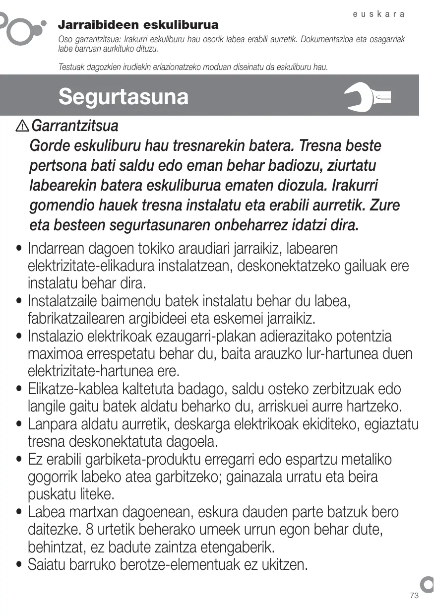 Garrantzitsua Gorde eskuliburu hau tresnarekin batera. Tresna beste pertsona bati saldu edo eman behar badiozu, ziurtatu labearekin batera eskuliburua ematen diozula. Irakurri gomendio hauek tresna instalatu eta erabili aurretik. Zure eta besteen segurtasunaren onbeharrez idatzi dira. Indarrean dagoen tokiko araudiari jarraikiz, labearen elektrizitate-elikadura instalatzean, deskonektatzeko gailuak ere instalatu behar dira. Instalatzaile baimendu batek instalatu behar du labea, fabrikatzailearen argibideei eta eskemei jarraikiz. Instalazio elektrikoak ezaugarri-plakan adierazitako potentzia maximoa errespetatu behar du, baita arauzko lur-hartunea duen elektrizitate-hartunea ere. Elikatze-kablea kaltetuta badago, saldu osteko zerbitzuak edo langile gaitu batek aldatu beharko du, arriskuei aurre hartzeko. Lanpara aldatu aurretik, deskarga elektrikoak ekiditeko, egiaztatu tresna deskonektatuta dagoela. Ez erabili garbiketa-produktu erregarri edo espartzu metaliko gogorrik labeko atea garbitzeko; gainazala urratu eta beira puskatu liteke. Labea martxan dagoenean, eskura dauden parte batzuk bero daitezke. 8 urtetik beherako umeek urrun egon behar dute, behintzat, ez badute zaintza etengaberik. Saiatu barruko berotze-elementuak ez ukitzen. 73