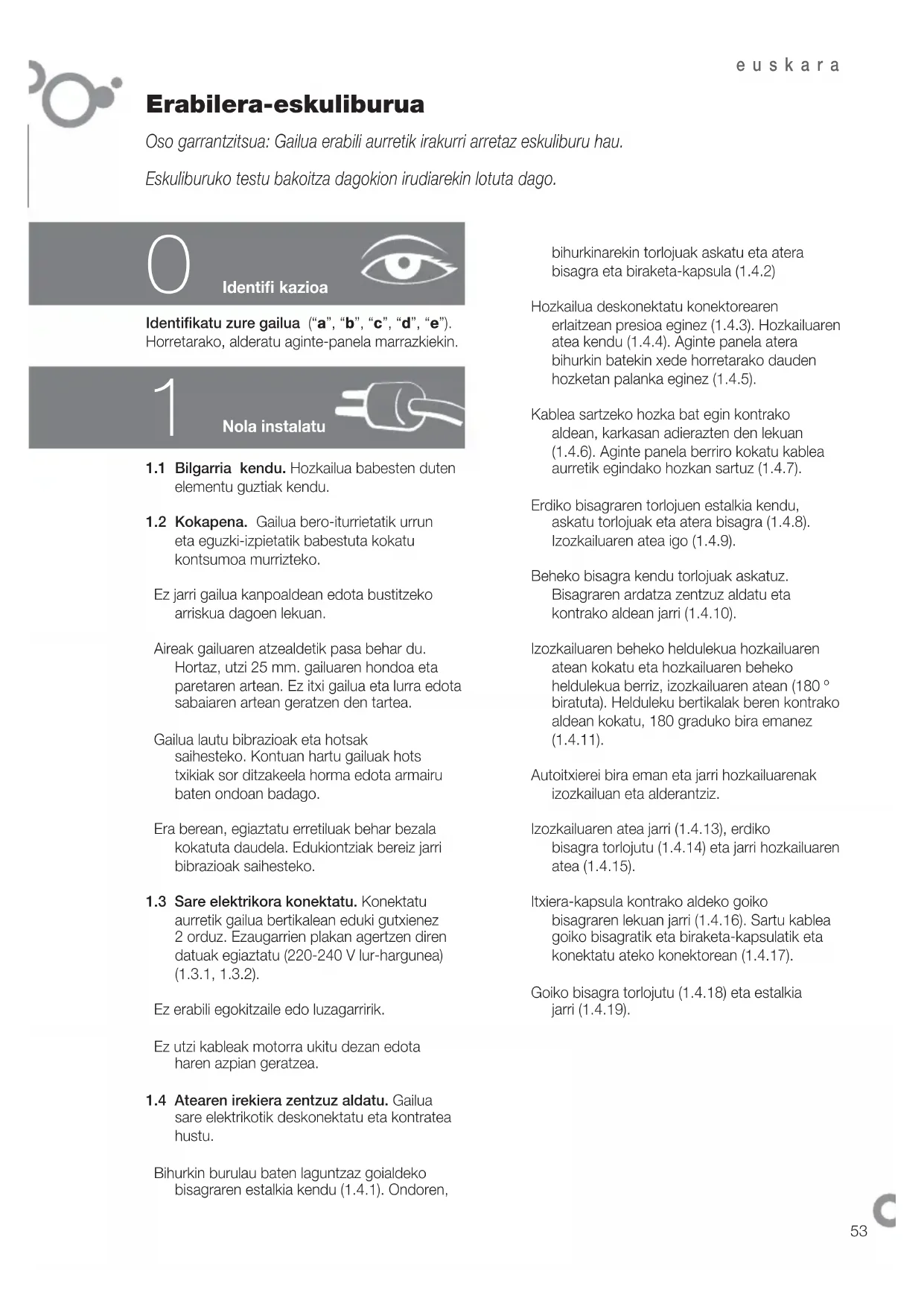 Erabilera-eskuliburua Oso garrantzitsua: Gailua erabili aurretik irakurri arretaz eskuliburu hau. Eskuliburuko testu bakoitza dagokion irudiarekin lotuta dago. Nola instalatu Identifi katu zure gailua (“a”, “b”, “c”, “d”, “e”). Horretarako, alderatu aginte-panela marrazkiekin.