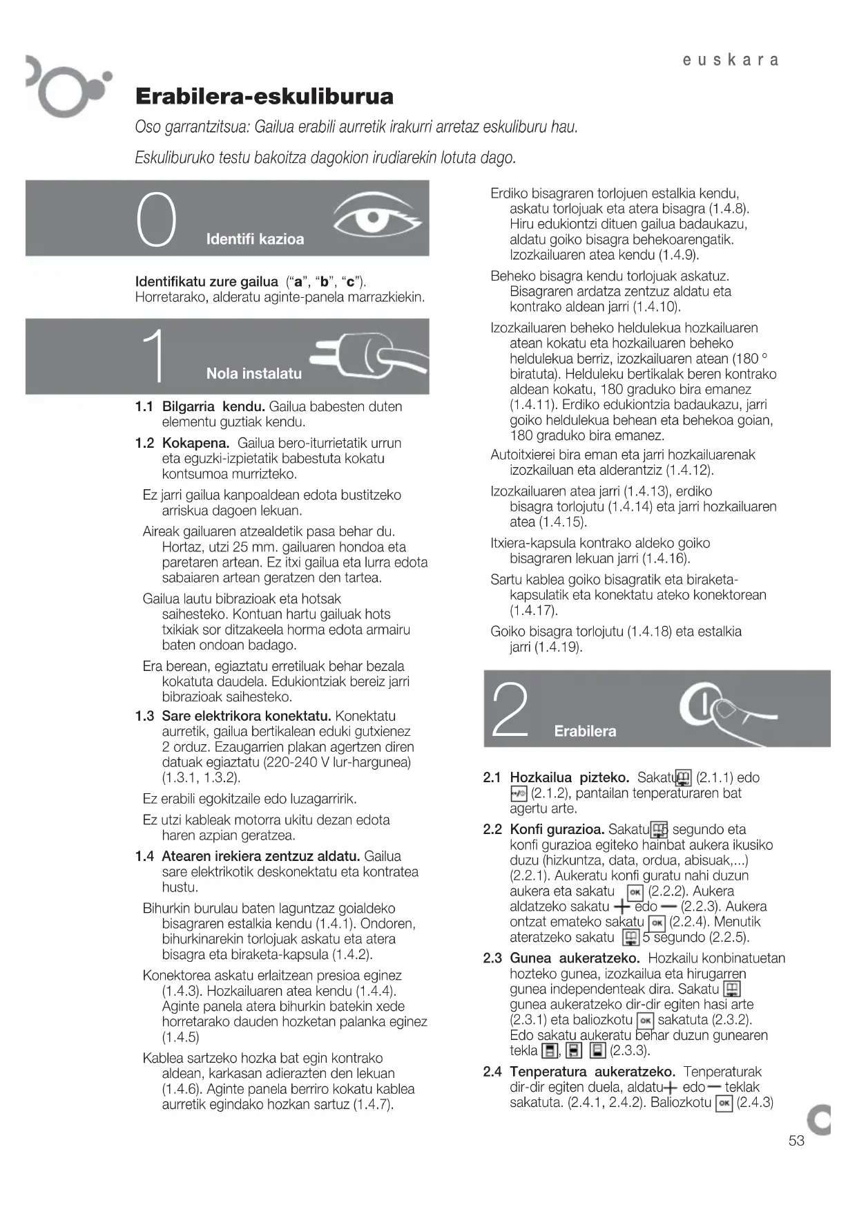 Erabilera-eskuliburua Oso garrantzitsua: Gailua erabili aurretik irakurri arretaz eskuliburu hau. Eskuliburuko testu bakoitza dagokion irudiarekin lotuta dago. Nola instalatu Identifi katu zure gailua (“a”, “b”, “c”). Horretarako, alderatu aginte-panela marrazkiekin.