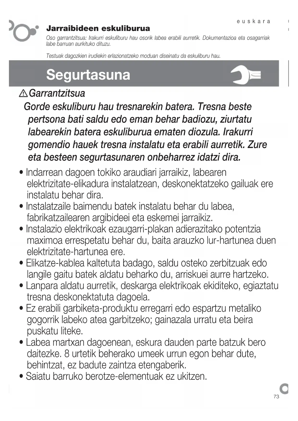 - Saiatu barruko berotze-elementuak ez ukitzen. Garrantzitsua Gorde eskuliburu hau tresnarekin batera. Tresna beste pertsona bati saldu edo eman behar badiozu, ziurtatu labearekin batera eskuliburua ematen diozula. Irakurri gomendio hauek tresna instalatu eta erabili aurretik. Zure eta besteen segurtasunaren onbeharrez idatzi dira.74 euskara