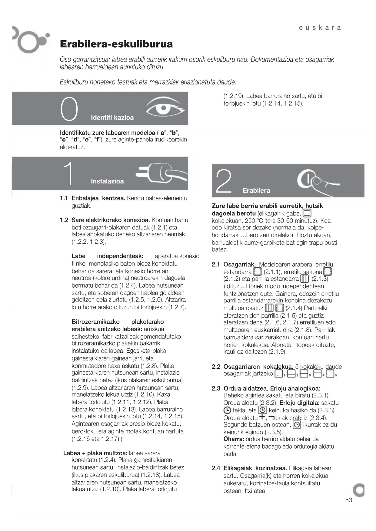 beti ezaugarri-plakaren datuak (1.2.1) eta labea ahokatuko deneko altzariaren neurriak (1.2.2, 1.2.3). Labe independenteak: aparatua konexio fi nko monofasiko baten bidez konektatu behar da sarera, eta konexio horretan neutroa (kolore urdina) neutroarekin dagoela bermatu behar da (1.2.4). Labea hutsunean sartu, eta soberan dagoen kablea goialdean gelditzen dela ziurtatu (1.2.5, 1.2.6). Altzarira lotu horretarako dituzun bi torlojuekin (1.2.7). Bitrozeramikazko plaketarako erabilera anitzeko labeak: arriskua saihesteko, fabrikatzaileak gomendatutako bitrozeramikazko plakekin bakarrik instalatuko da labea. Egosketa-plaka gainestalkiaren gainean jarri, eta konmutadore-kaxa askatu (1.2.8). Plaka gainestalkiaren hutsunean sartu, instalazio- baldintzak betez (ikus plakaren eskuliburua) (1.2.9). Labea altzariaren hutsunean sartu, maneiatzeko lekua utziz (1.2.10). Kaxa labera torlojutu (1.2.11, 1.2.12). Plaka labera konektatu (1.2.13). Labea barruraino sartu, eta bi torlojuekin lotu (1.2.14, 1.2.15). Agintearen osagarriak presio bidez kokatu, bero-foku eta aginte motak kontuan hartuta (1.2.16 eta 1.2.17).). Labea + plaka multzoa: labea sarera konektatu (1.2.4). Plaka gainestalkiaren hutsunean sartu, instalazio-baldintzak betez (ikus plakaren eskuliburua) (1.2.18). Labea altzariaren hutsunean sartu, maneiatzeko lekua utziz (1.2.10). Plaka labera torlojutu