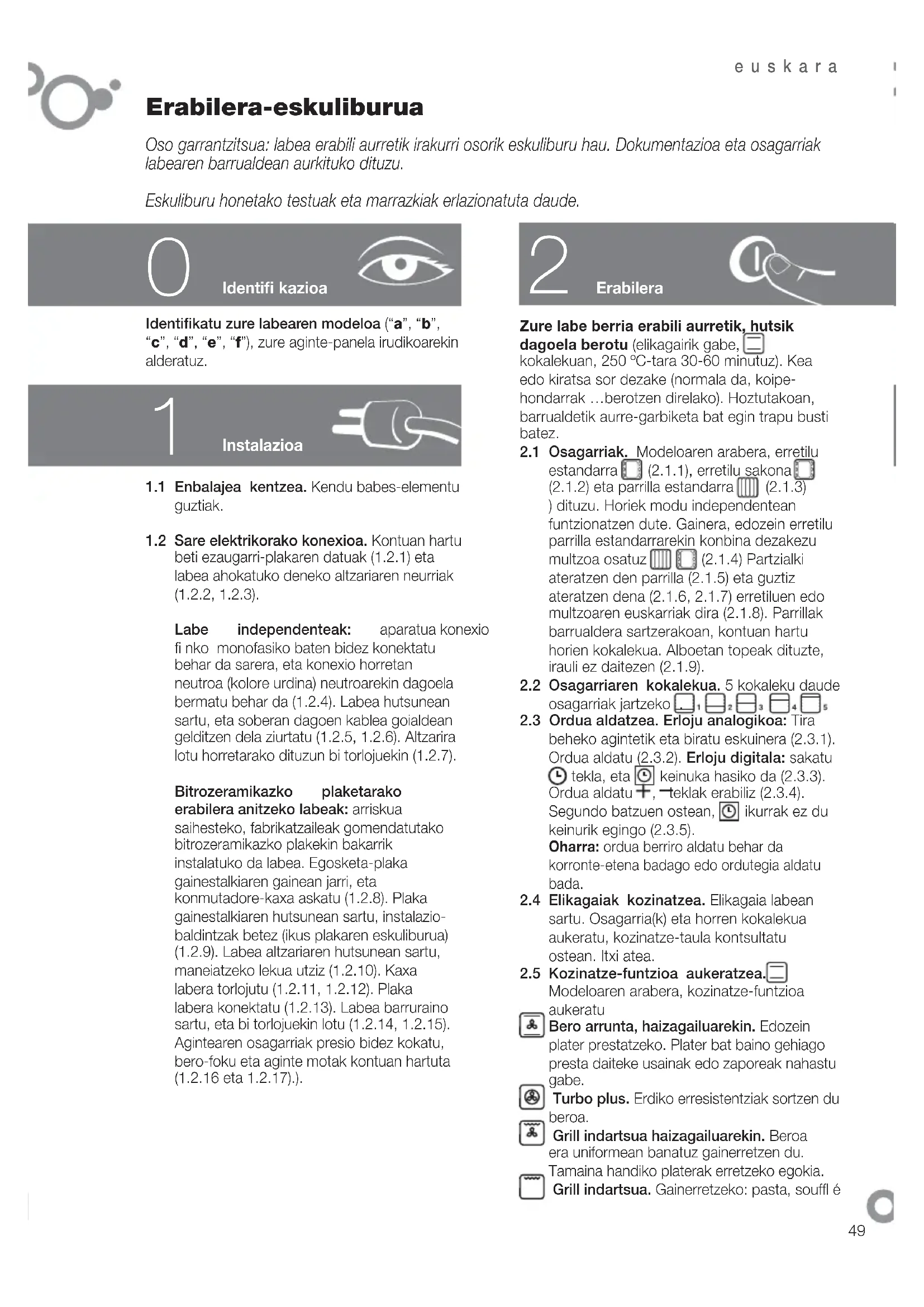 neutroak erabili, eta ondo sikatu trapu leun batez. Erabilera-oharrak: 1. Ziurtatu labea itzalita dagoela. 2. Ez erabili inoiz lurrunezko garbiketa- ekipamendurik.euskara