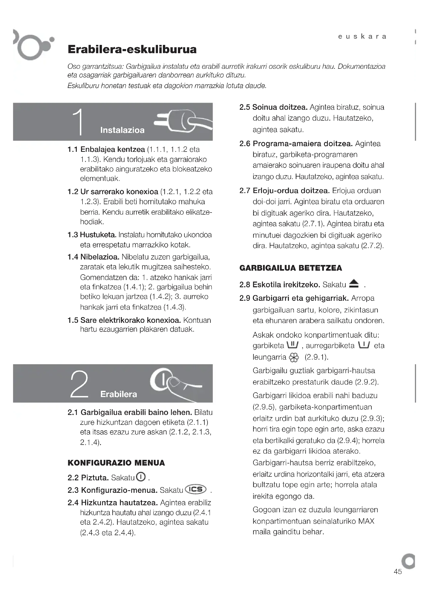 garbigailuan sartu, kolore, zikintasun eta ehunaren arabera sailkatu ondoren. Askak ondoko konpartimentuak ditu: garbiketa , aurregarbiketa eta leungarria (2.9.1). Garbigailu guztiak garbigarri-hautsa erabiltzeko prestaturik daude (2.9.2). Garbigarri likidoa erabili nahi baduzu (2.9.5), garbiketa-konpartimentuan erlaitz urdin bat aurkituko duzu (2.9.3); horri tira egin tope egin arte, aska ezazu eta bertikalki geratuko da (2.9.4); horrela ez da garbigarri likidoa aterako. Garbigarri-hautsa berriz erabiltzeko, erlaitz urdina horizontalki jarri, eta atzera bultzatu tope egin arte; horrela atala irekita egongo da. Gogoan izan ez duzula leungarriaren konpartimentuan seinalaturiko MAX maila gainditu behar. Oso garrantzitsua: Garbigailua instalatu eta erabili aurretik irakurri osorik eskuliburu hau. Dokumentazioa eta osagarriak garbigailuaren danborrean aurkituko dituzu. Eskuliburu honetan testuak eta dagokion marrazkia lotuta daude.