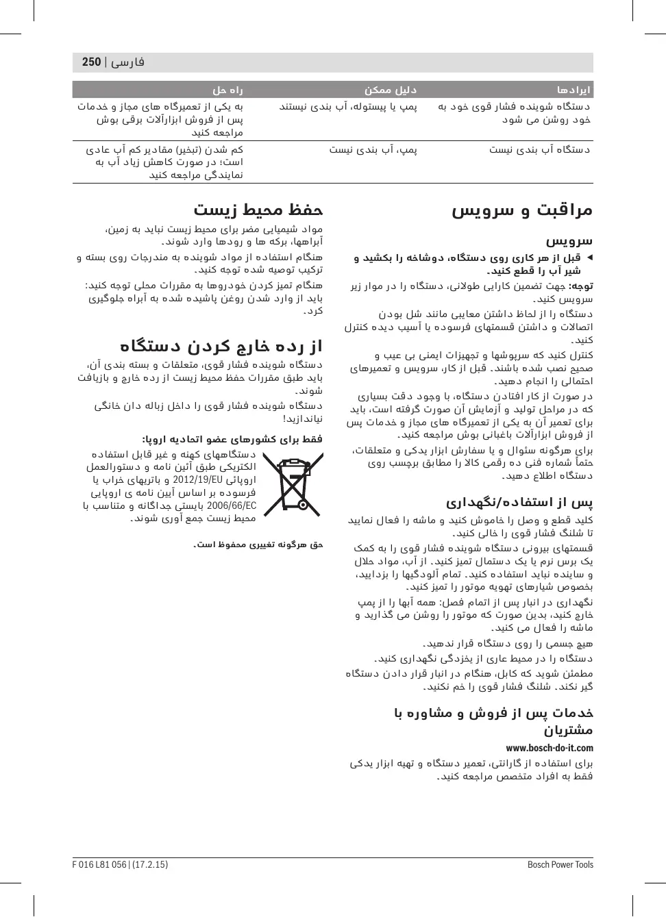 از رده خارج کردن دستگاه دستگاه شوینده فشار قوی ،متعلقات و بسته بندی آن، باید طبق مقررات حفظ محیط زیست از رده خارج و بازیافت دستگاه شوینده فشار قوی را داخل زباله دان خانگی فقط برای كشورهای عضو اتحادیه اروپا: دستگاههای كهنه و غیر قابل استفاده الكتریكی طبق آئین نامه و دستورالعمل اروپائی 2012/19/EUو باتریهای خراب یا فرسوده بر اساس آیین نامه ی اروپایی 2006/66/ECبایستی جداگانه و متناسب با محیط زیست جمع آوری شوند. حق هرگونه تغییری محفوظ است. نگهداری در انبار پس از اتمام فصل :همه آبها را از پمپ خارج کنید ،بدین صورت که موتور را روشن می گذارید و ماشه را فعال می کنید. هیچ جسمی را روی دستگاه قرار ندهید. دستگاه را در محیط عاری از یخزدگی نگهداری کنید. مطمئن شوید که کابل ،هنگام در انبار قرار دادن دستگاه گیر نکند .شلنگ فشار قوی را خم نکنید. خدمات پس از فروش و مشاوره با www.bosch-do-it.com برای استفاده از گارانتی ،تعمير دستگاه و تهيه ابزار يدكی فقط به افراد متخصص مراجعه كنيد. Bosch Power Tools )F 016 L81 056 | (17.2.15 | 251ىسراف