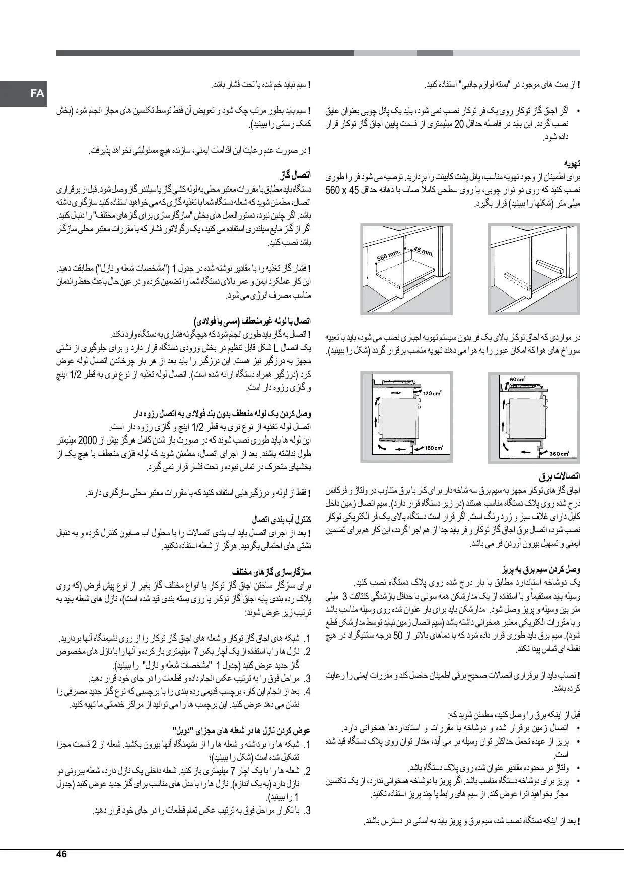 Pour garantir une bonne aération, la cavité d’encastrement doit être dépourvue de paroi arrière. Il est conseillé d’installer le four de manière à ce qu’il repose sur deux cales en bois ou bien sur un plan d’appui continu qui ait une découpe d’au moins 45 x 560 mm (voir figures).