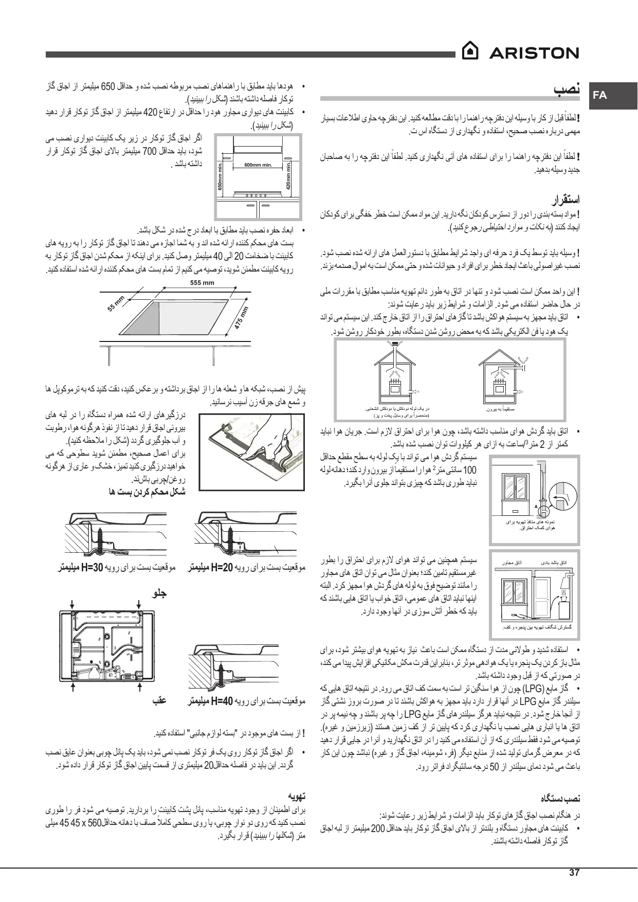 • (Pour la France et la Belgique) Les gaz de pétrole liquéfiés, plus lourds que l’air, se déposent et stagnent vers le bas. Les locaux qui contiennent donc des bouteilles de G.P.L doivent prévoir des ouvertures vers l’extérieur afin de permettre l’évacuation du gaz par le bas en cas de fuites accidentelles. Les bouteilles de GPL, qu’elles soient vides ou partiellement pleines, ne devront donc pas être installées ou entreposées dans des locaux qui se trouvent au dessous du niveau du sol (caves etc.). Il est opportun de n’entreposer dans le local que la bouteille que vous êtes en train d’utiliser, placée de façon à ne pas être sujette à l’action directe de sources de chaleur (fours, feux de bois, poêles etc.) qui peuvent atteindre des températures dépassant 50°C. Encastrement Pour une installation correcte de la table de cuisson, il faut se conformer aux instructions suivantes : • Les meubles jouxtant la table, dont la hauteur dépasse celle du plan de cuisson, doivent être placés à au moins 200 mm du bord du plan. • Les hottes doivent être installées conformément aux instructions reportées dans leur notice d’installation et à au moins 650 mm de distance (voir figure). • Les éléments hauts jouxtant la hotte doivent être placés à au moins 420 mm de distance du plan de travail (voir figure). En cas d’installation de la table de cuisson sous un élément haut, ce dernier devra être monté à au moins 700 mm de distance du plan. 600mm min. 420mm min.