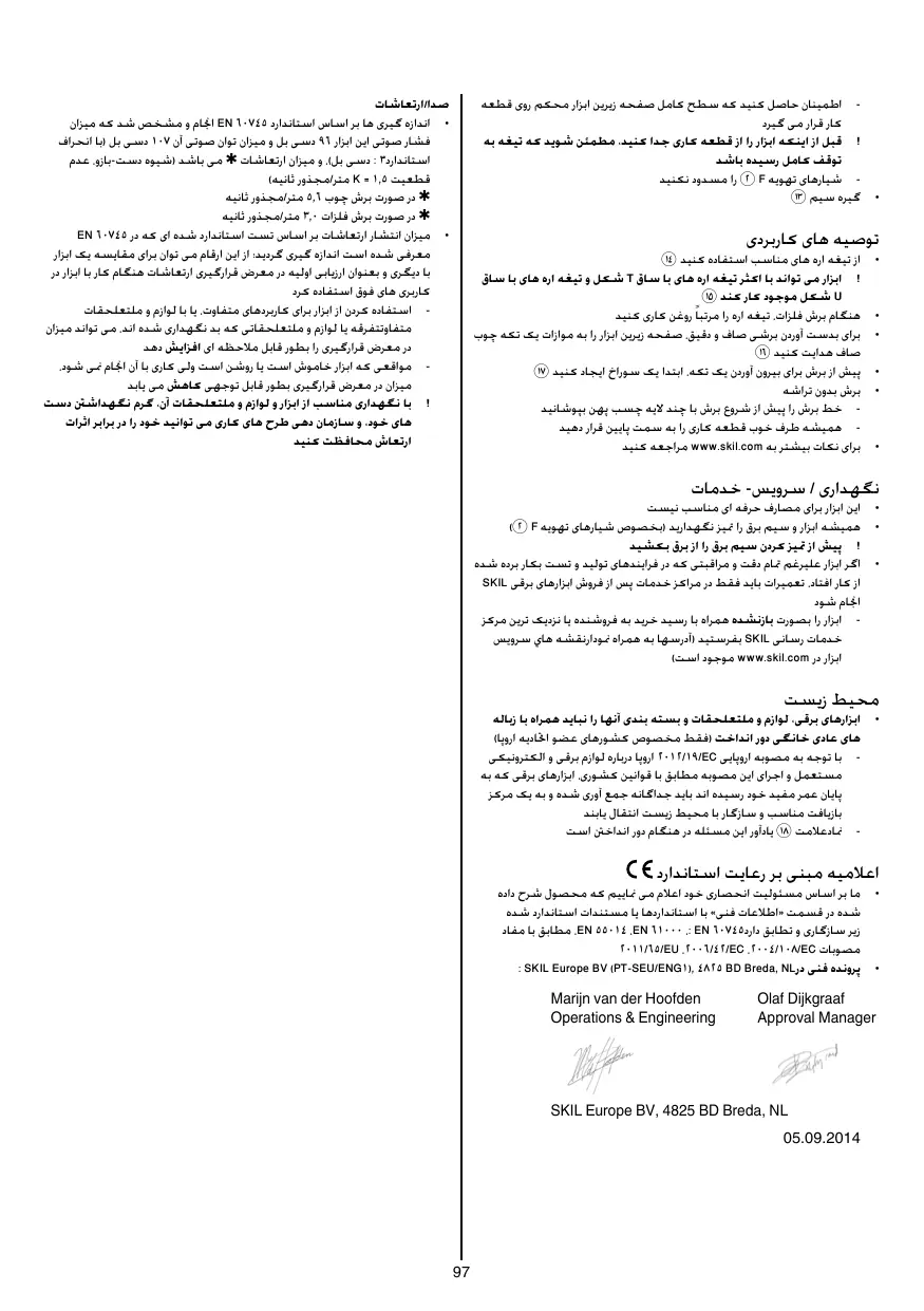 • Dossier technique auprès de: SKIL Europe BV (PT-SEU/ENG1), 4825 BD Breda, NL • Quand vous coupez des métaux, lubrifiez régulièrement la lame de scie de lubrifiant • Pour effectuer une coupe droite précise, guidez l’outil avec la plaque de base le long du côté d’un morceau de bois rectiligne ^ • Faites un avant-trou avant d’effectuer des découpes & • Couper sans éclats - couvrez la ligne de coupe des plusieurs couches d’un large ruban adhésif avant d’effectuer la coupe - toujours inversez la partie visible de la pièce à travailler • Pour des suggestions complémentaires voyez www.skil.com