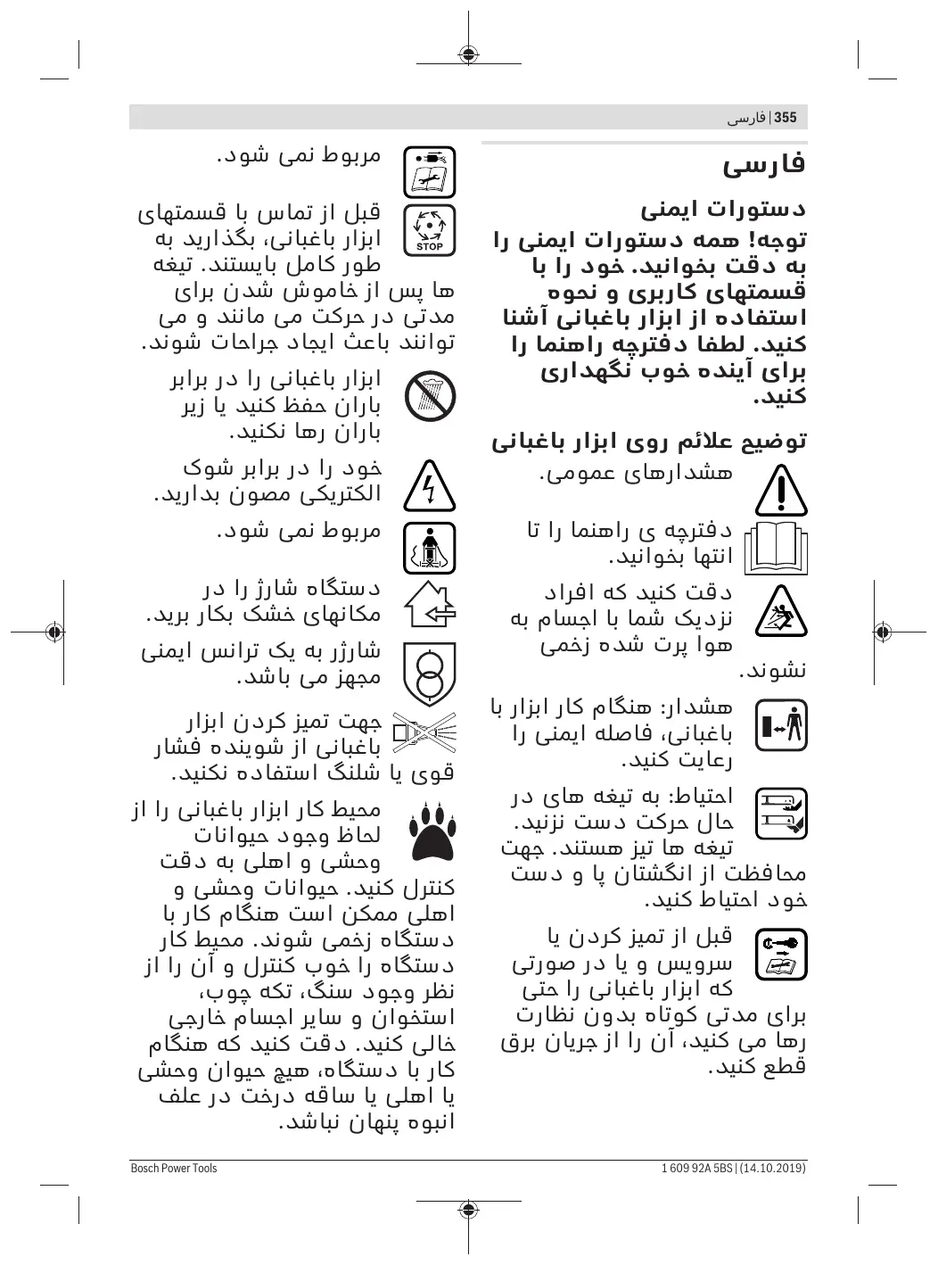 )1 609 92A 5BS | (14.10.2019 شارژر به یک ترانس ایمنی مجهز می باشد. جهت تمیز کردن ابزار باغبانی از شوینده فشار قوی یا شلنگ استفاده نکنید. محیط کار ابزار باغبانی را از لحاظ وجود حیوانات وحشی و اهلی به دقت کنترل کنید .حیوانات وحشی و اهلی ممکن است هنگام کار با دستگاه زخمی شوند .محیط کار دستگاه را خوب کنترل و آن را از نظر وجود سنگ ،تکه چوب، استخوان و سایر اجسام خارجی خالی کنید .دقت کنید که هنگام کار با دستگاه ،هیچ حیوان وحشی یا اهلی یا ساقه درخت در علف انبوه پنهان نباشد. Bosch Power Tools فارسی | 356