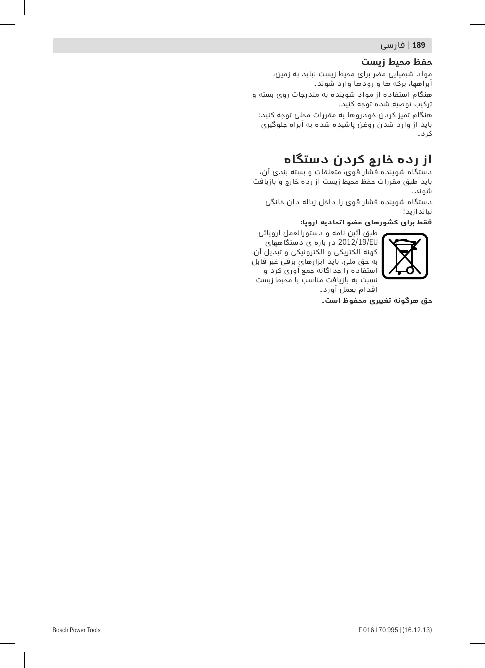 از رده خارج کردن دستگاه دستگاه شوینده فشار قوی ،متعلقات و بسته بندی آن، باید طبق مقررات حفظ محیط زیست از رده خارج و بازیافت دستگاه شوینده فشار قوی را داخل زباله دان خانگی فقط برای كشورهای عضو اتحادیه اروپا: طبق آئین نامه و دستورالعمل اروپائی 2012/19/EUدر باره ی دستگاههای كهنه الكتریكی و الكترونیكی و تبدیل آن به حق ملی ،باید ابزارهای برقی غیر قابل استفاده را جداگانه جمع آوری كرد و نسبت به بازیافت مناسب با محیط زیست اقدام بعمل آورد. حق هرگونه تغییری محفوظ است. )F 016 L70 995 | (16.12.13 Bosch Power Tools ىسراف | 190